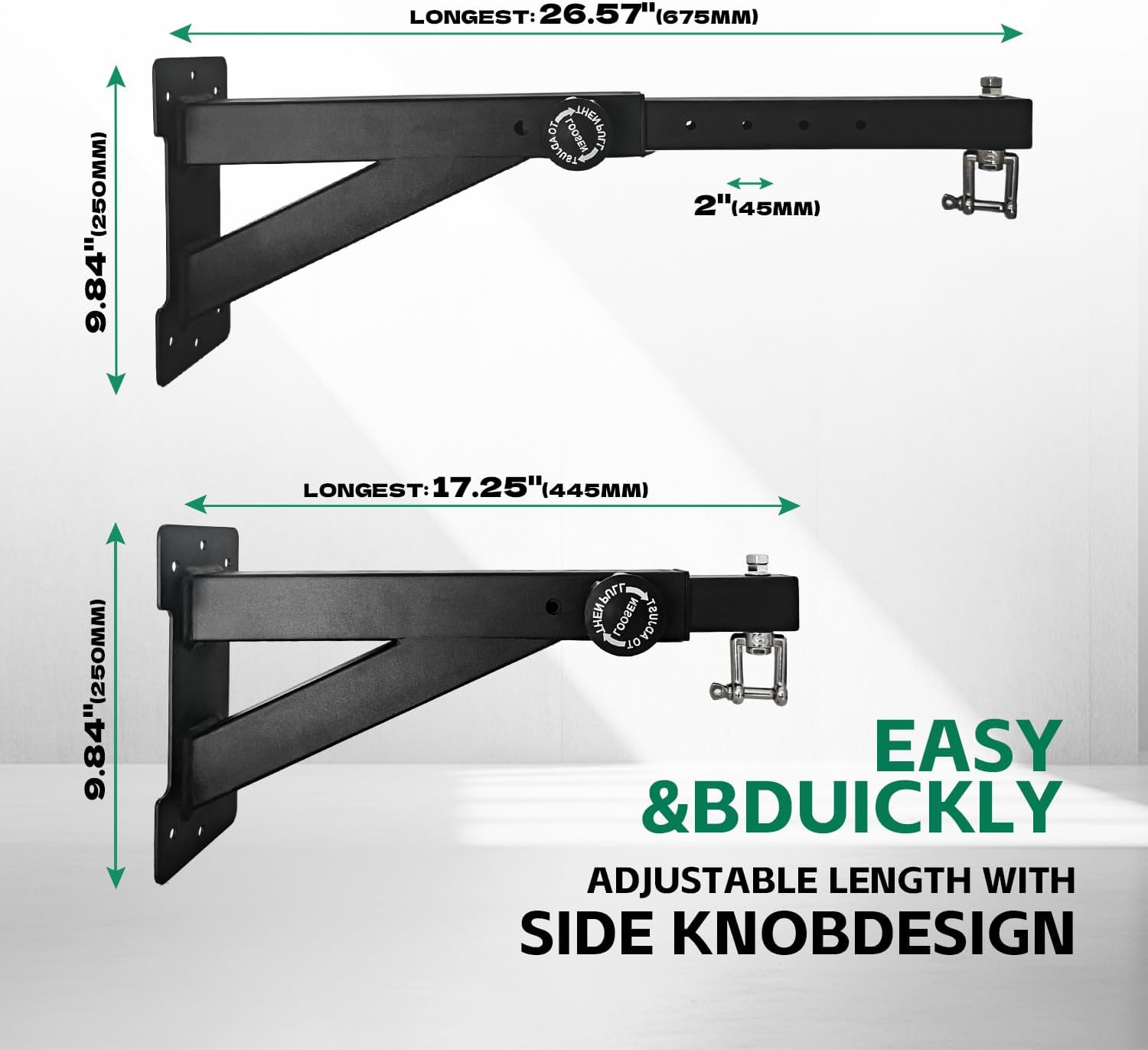 - Adjustable Length:The length can be adjusted from 17.5 inches to 26.3 inches, with 6 different levels to accommodate a variety of spaces and bag sizes.The spring knob design allows for quick and easy adjustment of the speed bag mount length.When you see the hole next to it, the spring knob can lock the position.