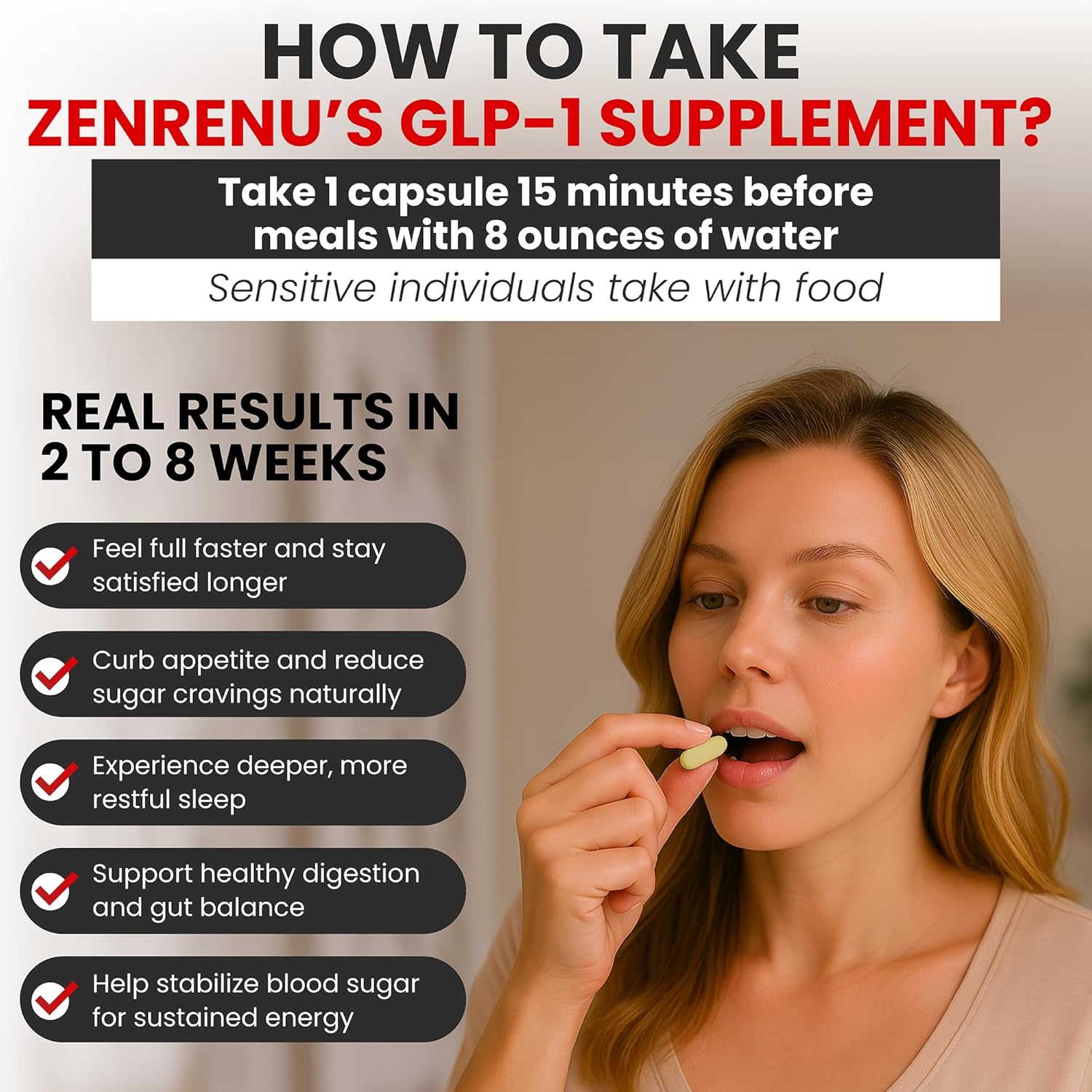 - Holistic GLP-1 Support: ZenRenu 11-in-1 is carefully formulated to promote optimal health by supporting natural GLP-1. This comprehensive blend of 11 key ingredients works synergistically to support metabolism and gut health to help to maintain overall wellness and vitality. Take 1 Capsule 15 minutes before meals.