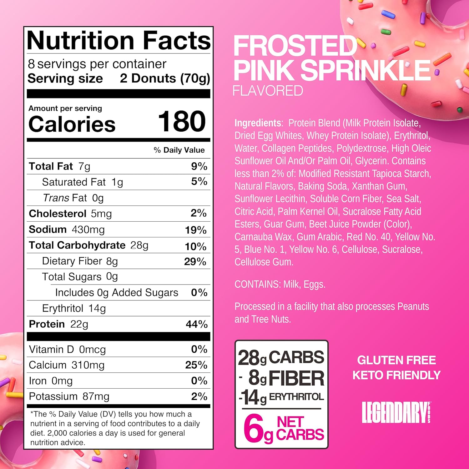Legendary Foods 22gr Protein Donuts - Frosted Pink Sprinkle 8x (2 Donuts per Pack), High Protein, Zero Sugar, Gluten Free, Low Carb, Keto Friendly Snack, Healthy Donut GLP-1, Diabetic, Bariatric Diets
