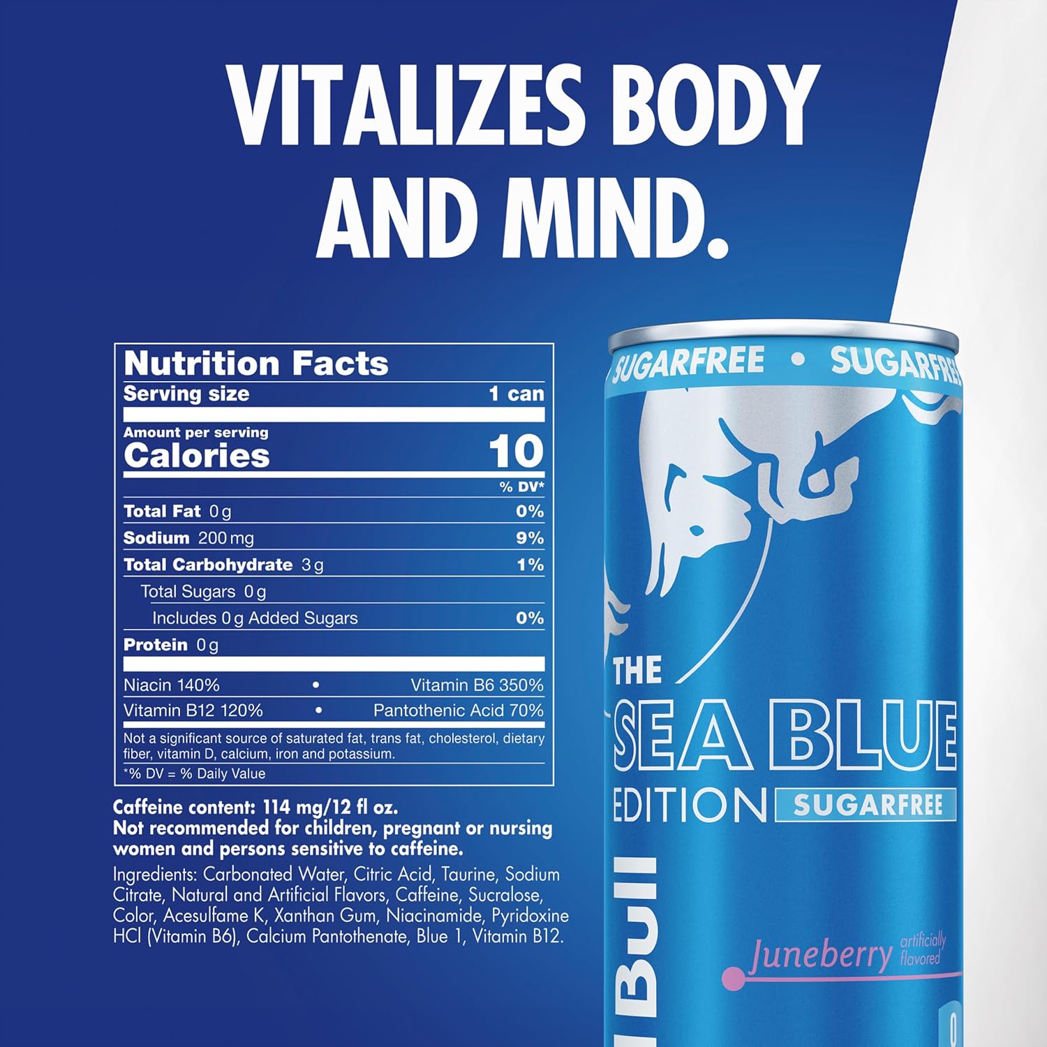 - Enjoy the enticing taste of Juneberry in the Red Bull Sea Blue Edition Sugar Free; Features taurine, an amino acid, plus four essential B-group vitamins B3, B6, B12 and B5, which contribute to normal energy-yielding metabolism