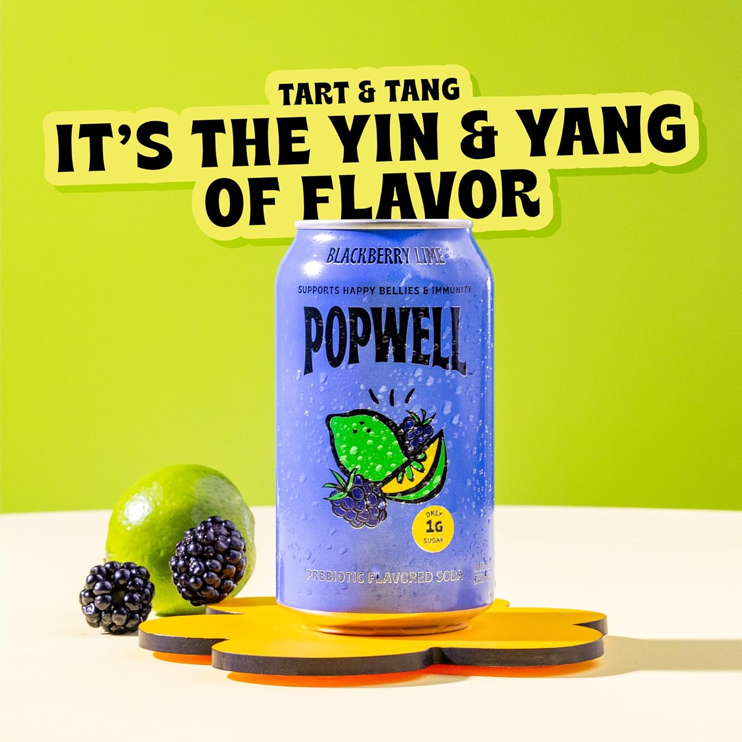 Popwell Blackberry Lime Better-For-You Prebiotic Soda, with 6g Fiber, 1g Sugar, Vitamins and Immunity Support, 12 fl oz Cans (pack of 12)