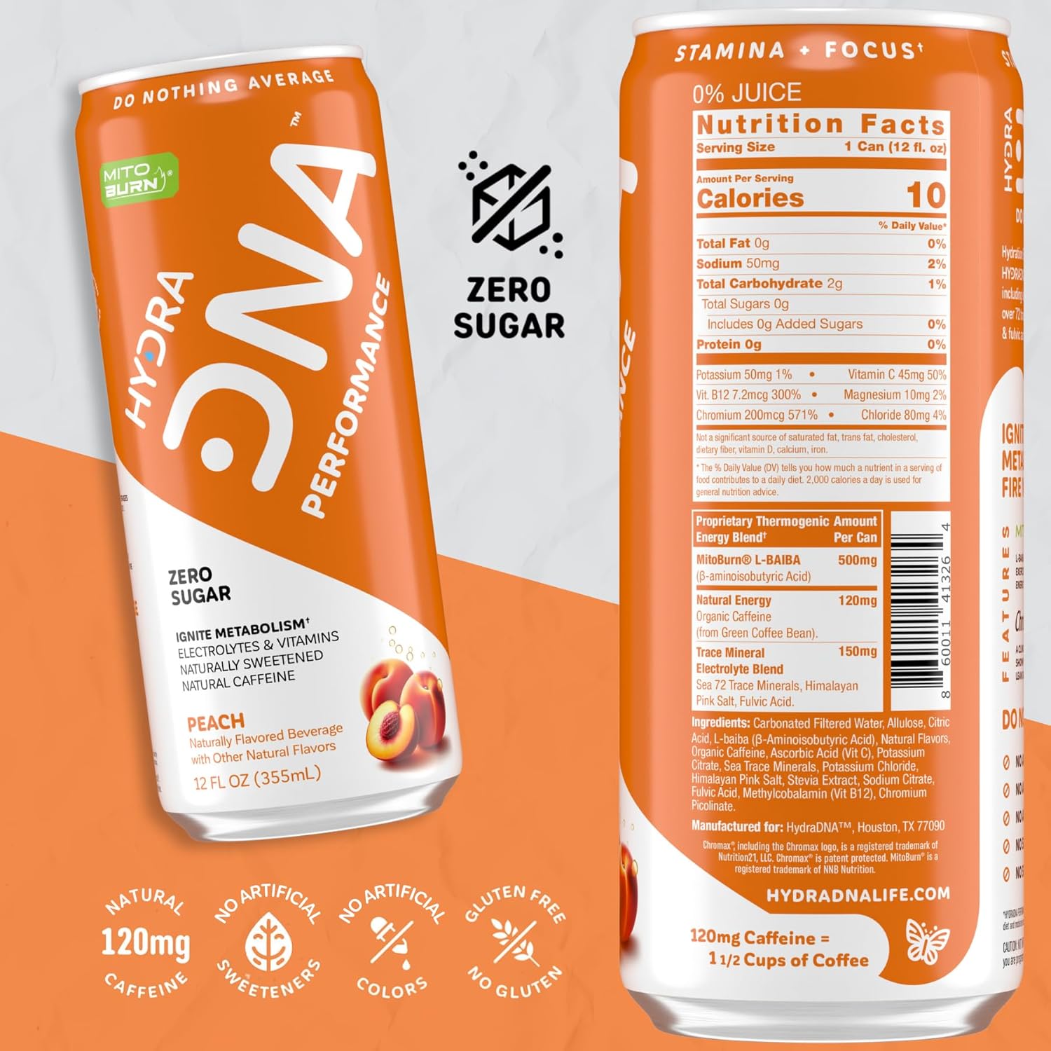 - HYDRA DNA NATURAL FUEL: Packed with 120 mg of organic caffeine, our peach flavor Performance Drink delivers a clean, sustained boost to keep you alert throughout the day without the jitters!