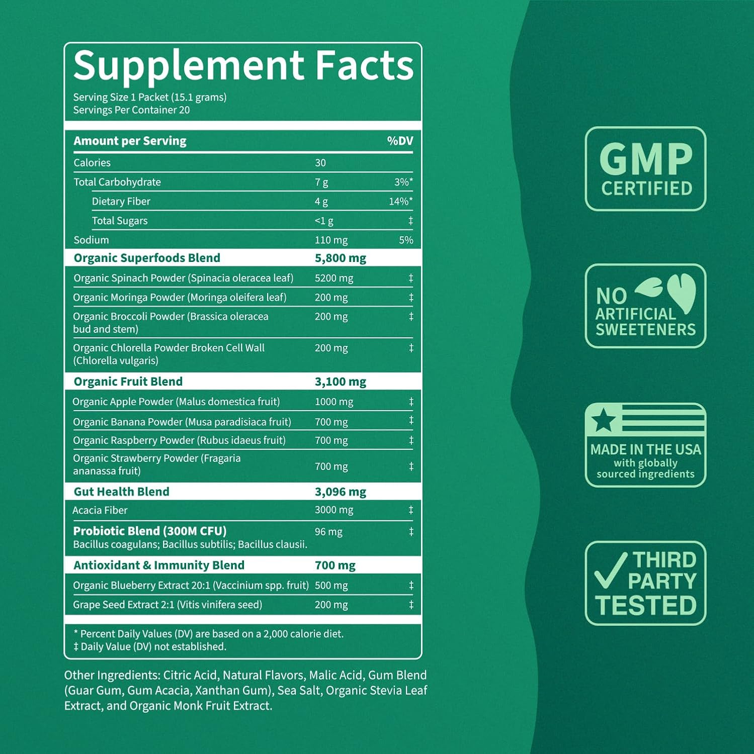 Supergreens Premium Superfood Greens Drink Mix w/Chlorella, Moringa, Spinach & Broccoli + Digestive Enzymes & Probiotic Blend -Nutrient-Packed Powder (Sour Watermelon 20 SRV, Travel Pack)
