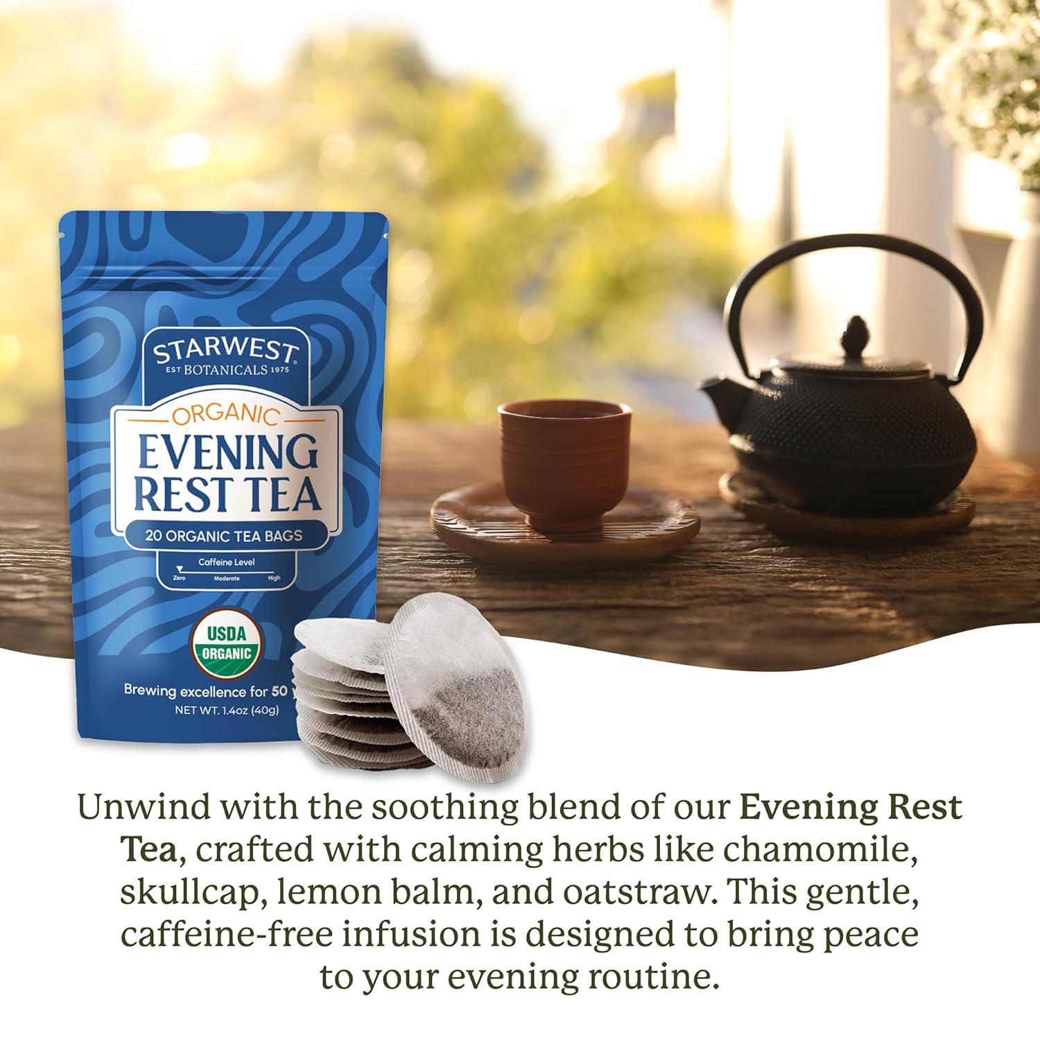 - SLEEP TEA FOR BEDTIME: Unwind with the calming blend of Starwest Botanicals' Evening Rest Tea Bags, designed to bring peace to your evening routine. Relax and let go of the day's worries