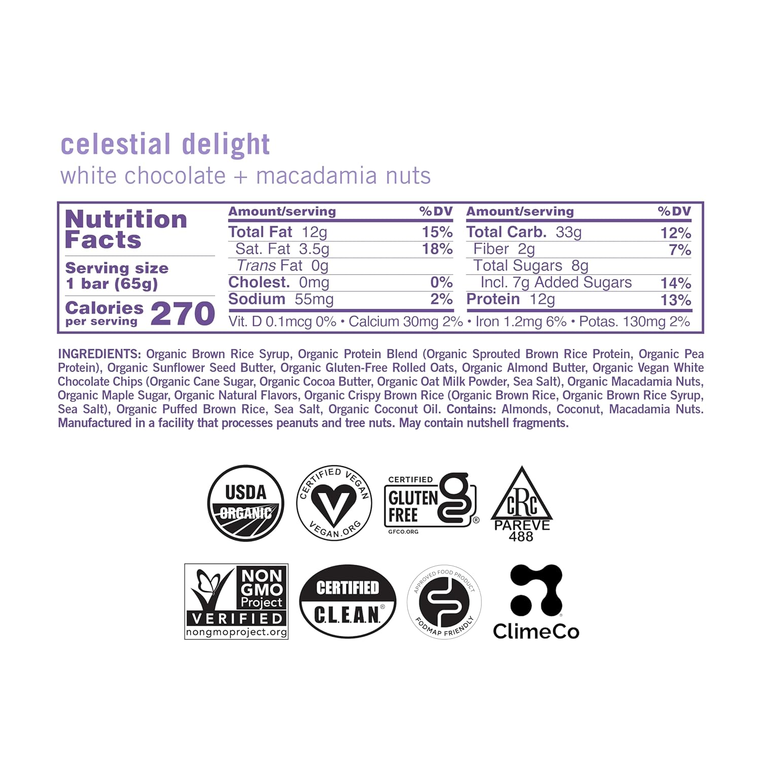 - HEALTHY INDULGENCE: A cosmic combination of rich macadamia nuts, smooth organic almond butter, and crispy brown rice makes our Celestial Delight MacroBar a heavenly flavor experience destined to brighten any moment.