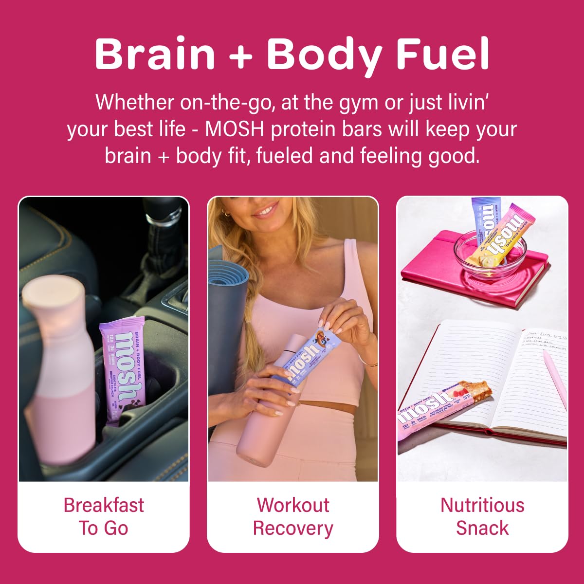 - MIND-BLOWING INGREDIENTS - MOSH clean protein bars are loaded with brain-enhancing nutrients like lionβs mane, ashwagandha, omega 3's, flaxseed, vitamin B12, and D3. Using a science-backed formulation called Cognizin, we provide nutritious and tasty bars for an active and busy lifestyle. They are perfect as a healthy midday snack for kids or a great addition to a college care package.
