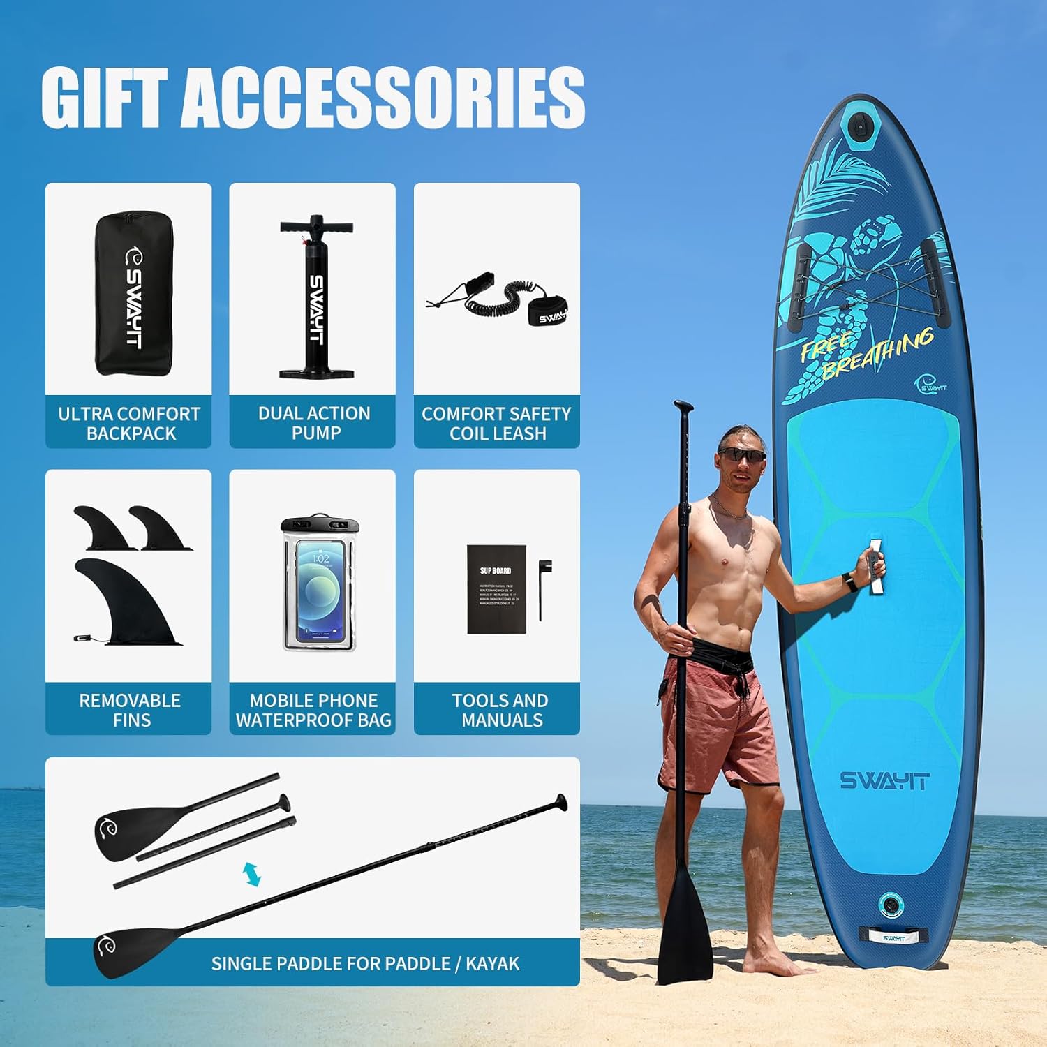 - Complete Adventure Paddle Board Kit: Comes with adjustable paddle, dual-action pump, travel backpack, ankle leash, repair kit, and dry bag for your gear.