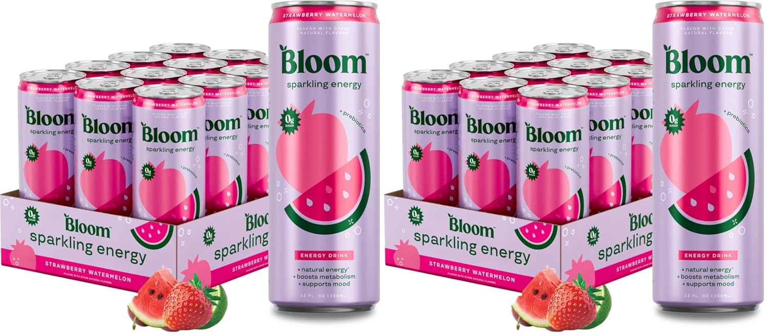 Bloom Nutrition Sparkling Energy Drink - Natural Caffeine, Zero Sugar, 180mg Caffeine - Antioxidant-Rich with Green Coffee Bean, Green Tea Extract, Prebiotics - Strawberry Watermelon - 12oz 24 Pack