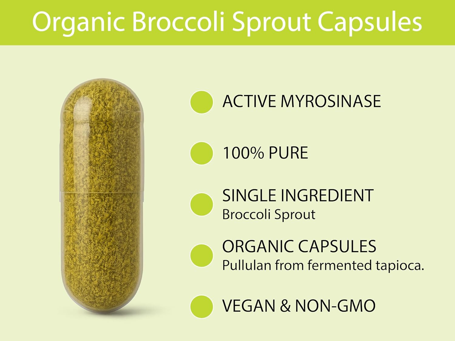- INGREDIENTS - Freeze-Dried Organic Broccoli Sprout Powder (whole sprout), Certified Organic Vegan (Pullulan) Capsule