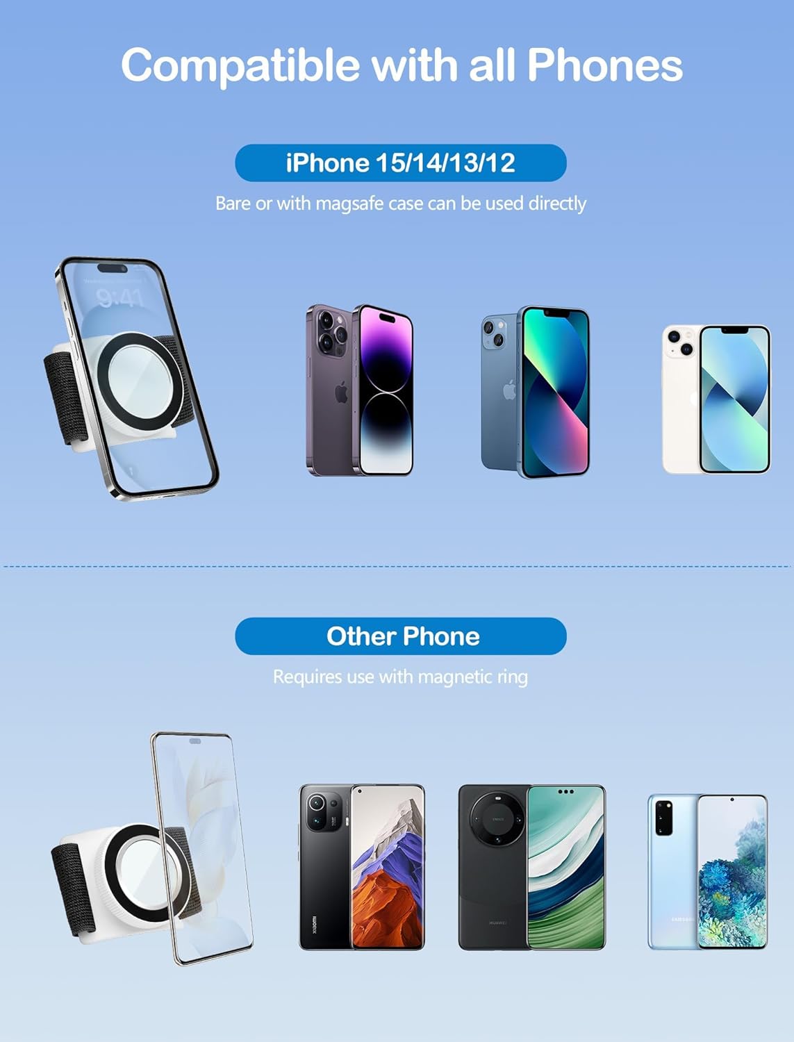 - [Universal Compatibility]: iPhone 16/15/14/13/12 Pro/Mini with MagSafe or MagSafe-compatible cases can be used directly. For phones or cases without MagSafe, use in conjunction with the supplied magnetic loop, peel off the 3M adhesive of the magnetic ring and stick it firmly to your phone or case. Stability may be affected for oversized or heavier phones (e.g. iPhone 16 Pro Max).