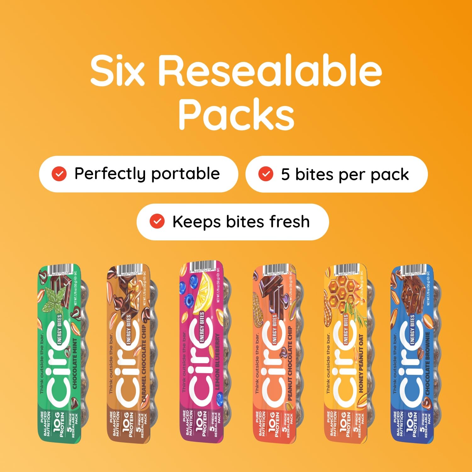- NEW VARIETY 6 PACK: Indulge your taste buds while increasing your daily protein intake with 6 packages of 5 bite-sized energy bites. The Variety Pack contains one of each flavor: Peanut Chocolate Chip, Honey Oat, Chocolate Brownie, Lemon Blueberry, Carmel Chocolate Chip, and Mint Chocolate Chip energy bites. Each 5-bite pack is made with 10g of whey protein and packed with whole grains, nuts and fruits. These protein balls will give you the energy and nutrition to tackle any activity.
