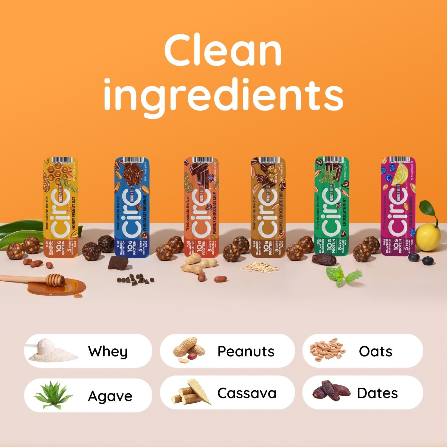 - PORTABLE ENERGY BITES: CirC reimagined the protein bar as 5 snackable energy bites, perfect for on-the-go, at work, or post-workout. Made with simple, natural ingredients like peanuts, oats, dates, and sustainable whey crisp, each high protein energy ball offers a well-balanced, homemade taste.