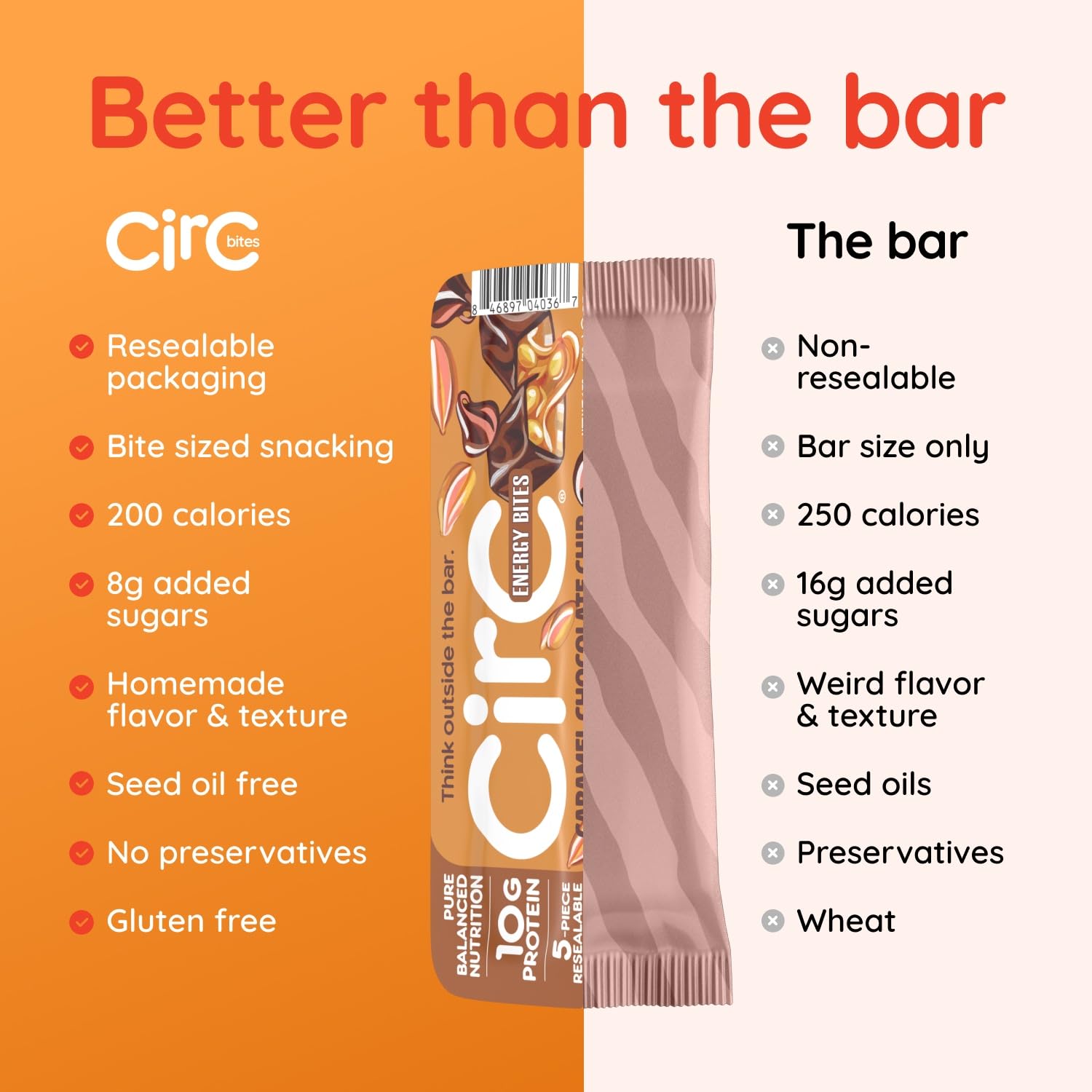 - QUALITY INGREDIENTS: Peanut-first for brain and body health, CirC Bites are made with clean, simple ingredients—no stevia, sugar alcohols, sucralose, seed oils, or gluten. Each bite contains a balanced blend of peanuts, tapioca, agave, whey, 4g of collagen, and allulose for a naturally low-sugar treat. Free from soy, gluten, preservatives, and artificial sweeteners.