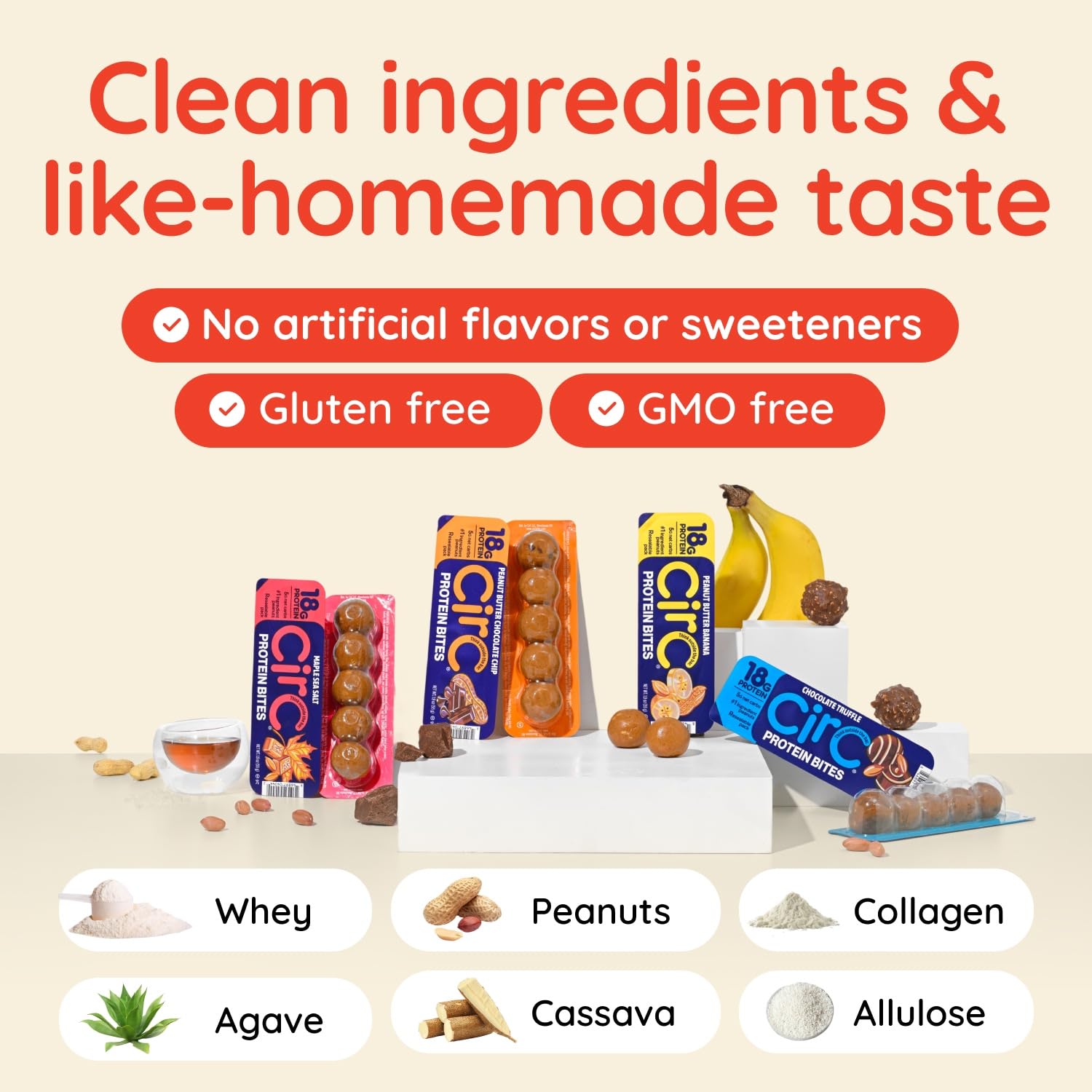 - PORTABLE PROTEIN BITES: CirC reimagined the protein bar as 5 snackable protein balls perfect for on-the-go, at work, or post-workout. Made with wholesome ingredients like peanuts, whey, agave, and collagen, these protein balls have a smooth texture and clean, natural taste.