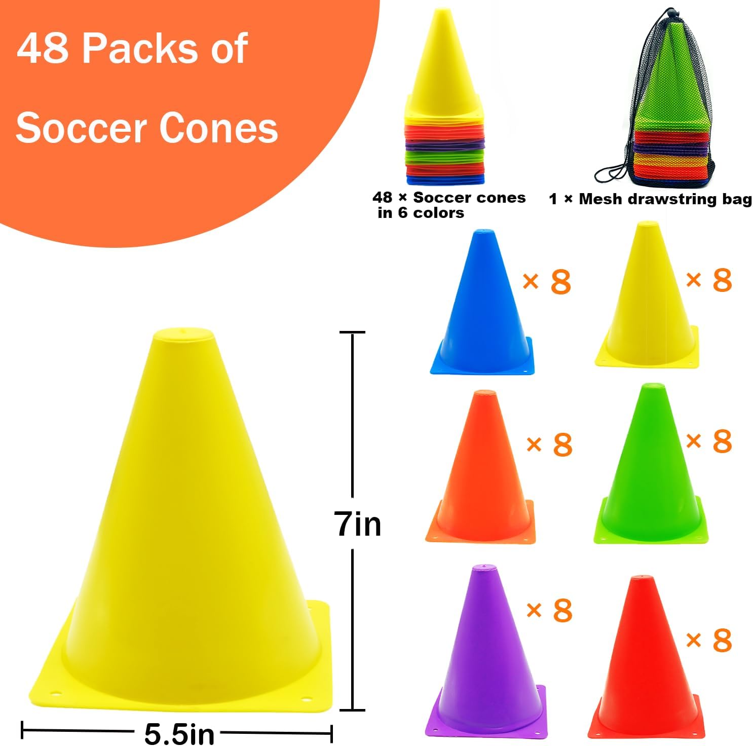 - PORTABLE And PRACTICAL DESIGN: Each training cone stands 7" tall with a 5.1" base diameter, equipped with 4 holes for secure field placement. The included mesh drawstring bag allows for easy storage and transport of all cones.
