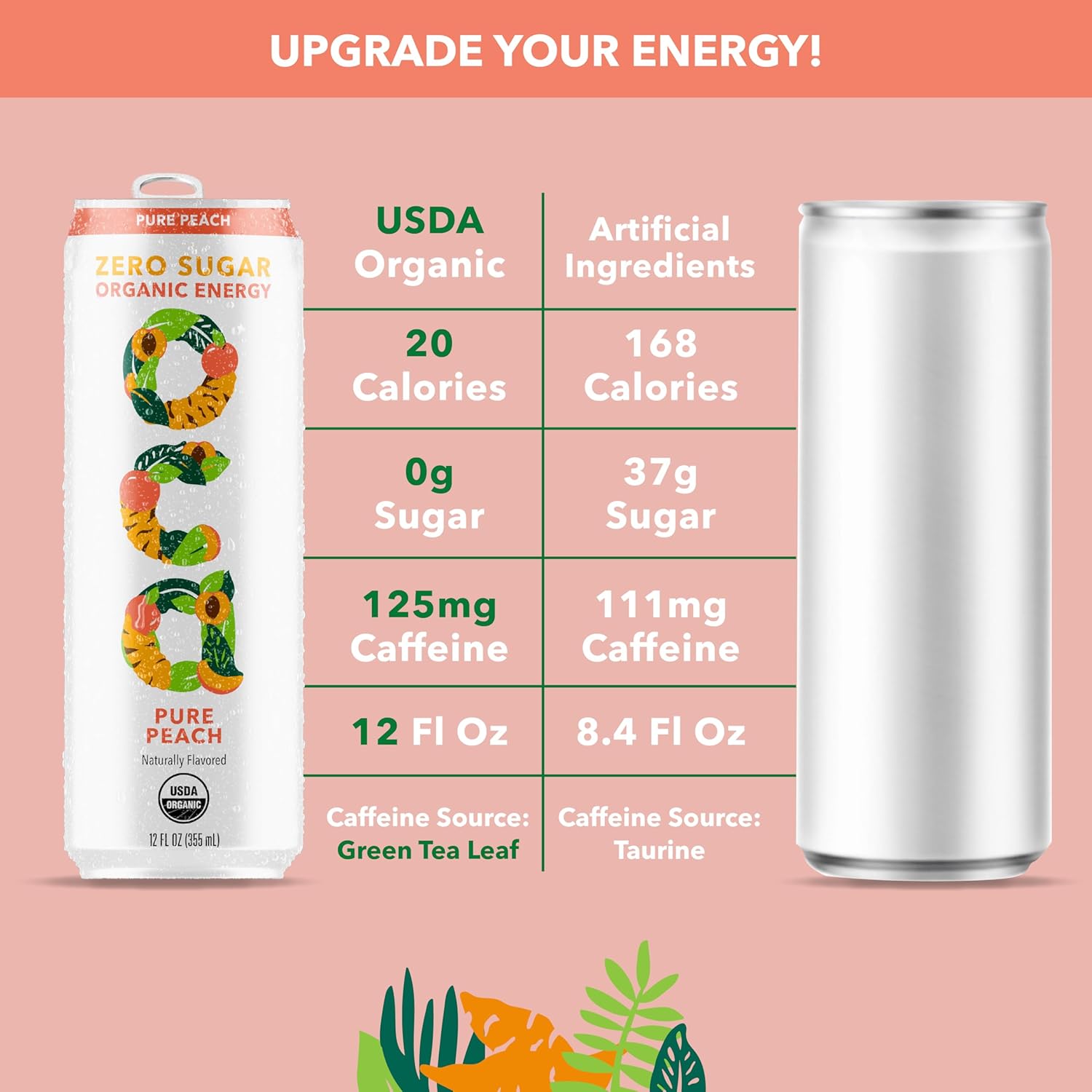 OCA ZERO Pure Peach, Organic energy drink, zero sugar, gluten-free, vegan plant-based, 12 Fl Oz (12-pack)