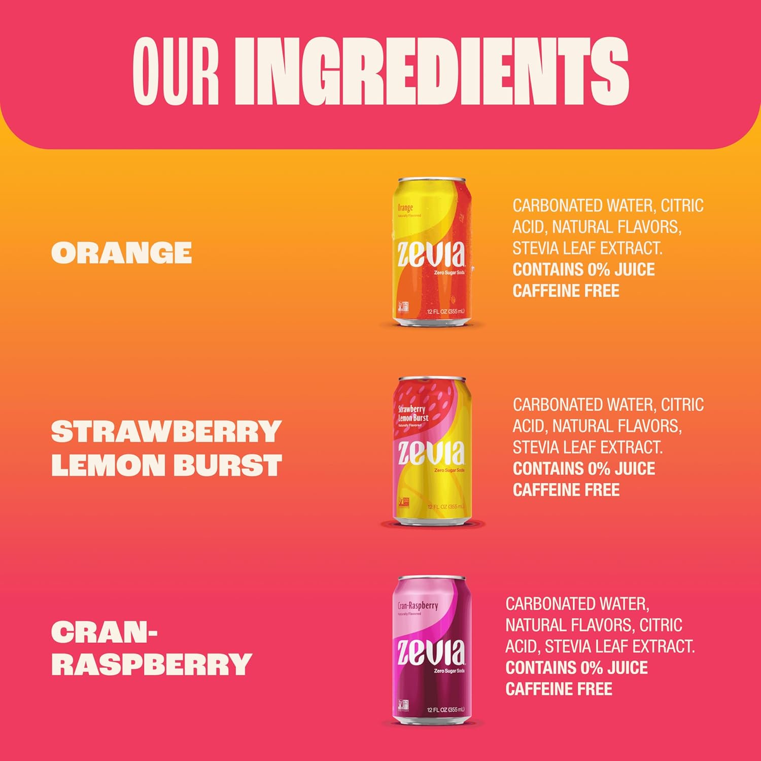 - ZERO SUGAR, ALL FLAVOR: For those of us who love all the refreshingly fruity soda flavors, there's the Zevia soda Fruity Variety Pack - 8 cans each of 3 amazing flavors - Strawberry Lemon Burst, Cran-Raspberry and Orange Soda. These are zero sugar sodas at their best.