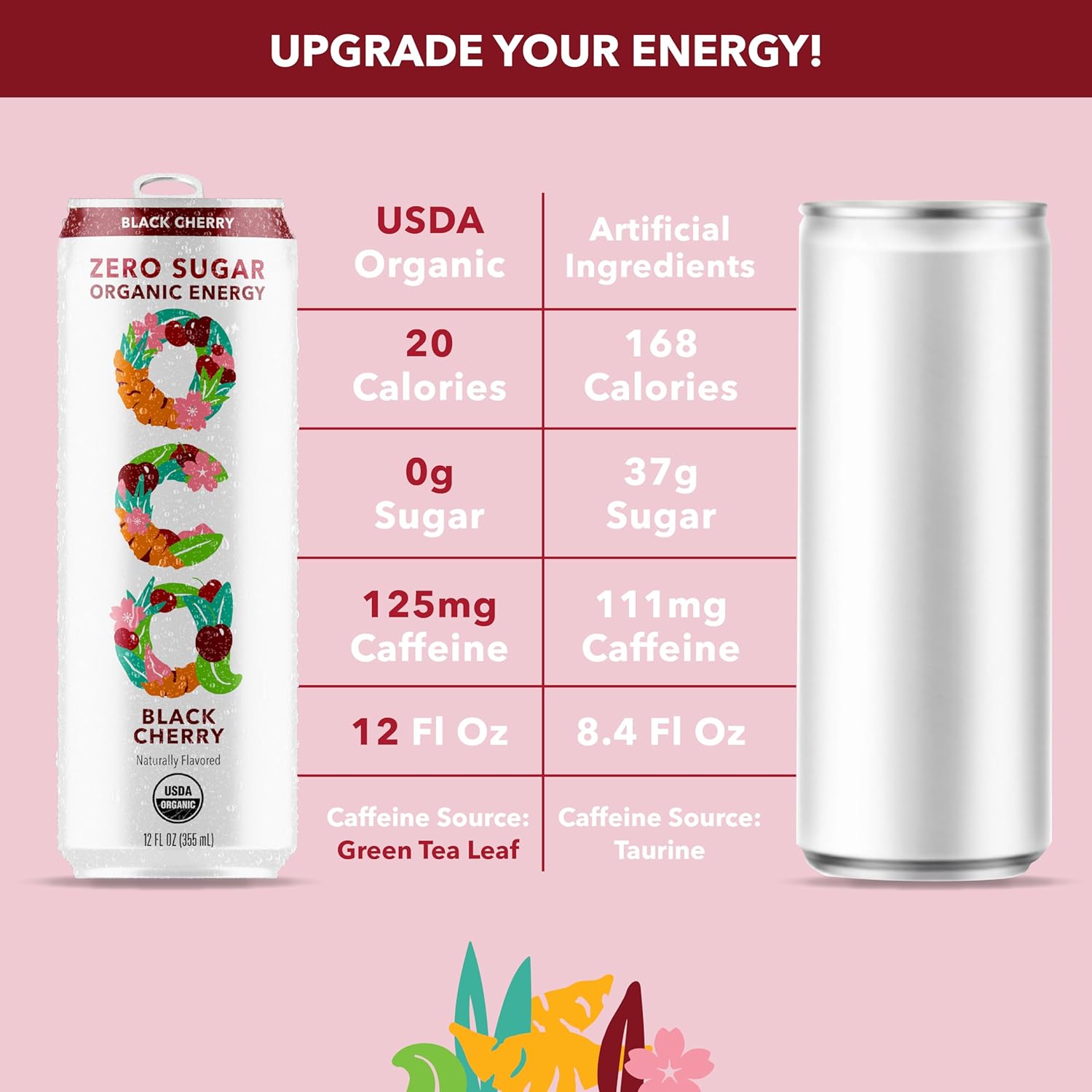 OCA ZERO Black Cherry, Organic energy drink, zero sugar, gluten-free, vegan plant-based, 12 Fl Oz (12-pack)