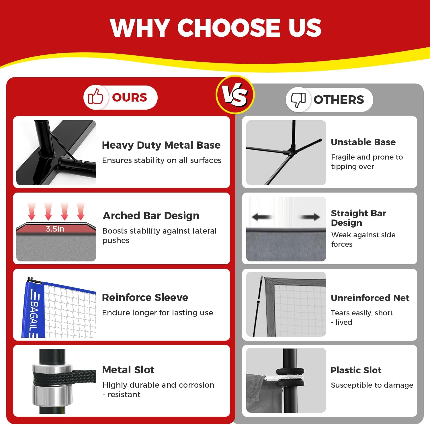 - Professional-Grade Stability: Our volleyball net features a heavy-duty square metal base for extra stability and anti-tip protection. The powder-coated steel frame resists rust in all weather. Its 5-ply net is tear-proof, withstanding powerful spikes. 16mm thick fiberglass poles endure intense uses, absorbing impacts to prevent damage, ensuring long-lasting performance