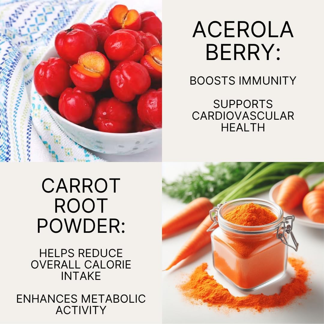 - Special Ingredients : Acerola Berry Powder, Barley Grass Powder, Carrot Root Powder, ChromeMate, Rice Bran Powder