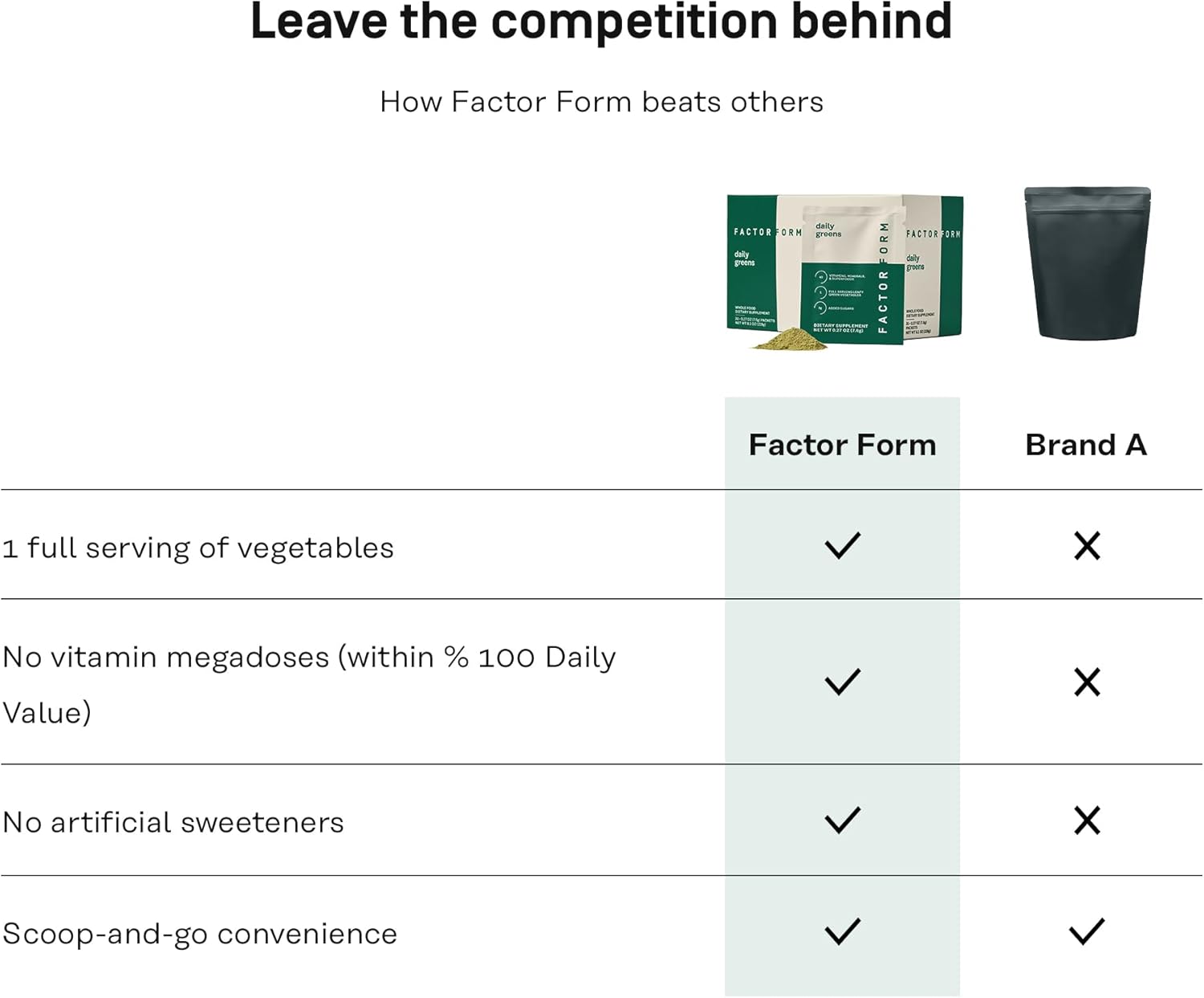 - 40 POWERFUL INGREDIENTS & ONE SERVING OF VEGETABLES FOR DAILY HEALTH – Get your daily dose of greens with Factor Form Daily Greens. Packed with 40 vitamins, minerals, and superfoods, including a full serving of leafy greens, prebiotics, probiotics, antioxidants, and functional adaptogens. This one-step daily formula makes it easy to help fill nutrient gaps and support overall wellness.