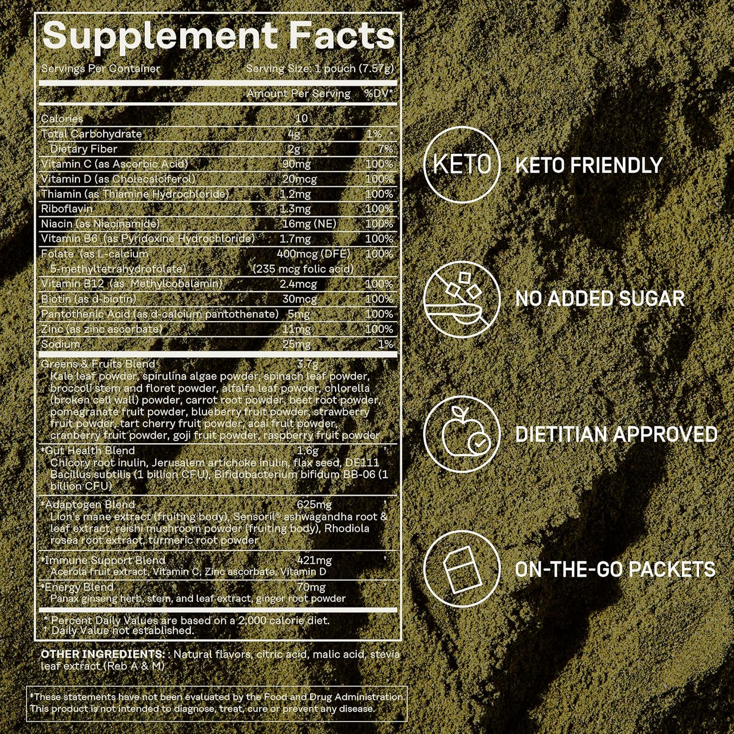 - SUPPORTS GUT HEALTH, ENERGY & IMMUNITY – Daily Greens is formulated to support digestive health, cognitive function, a healthy immune system, and everyday stress reduction. With clinically substantiated ingredients like probiotics, ashwagandha, ginseng, and vitamin C, this superfood blend helps you feel your best every day. Plus, it's keto-friendly, plant-based, with no added sugar—designed for all lifestyles.