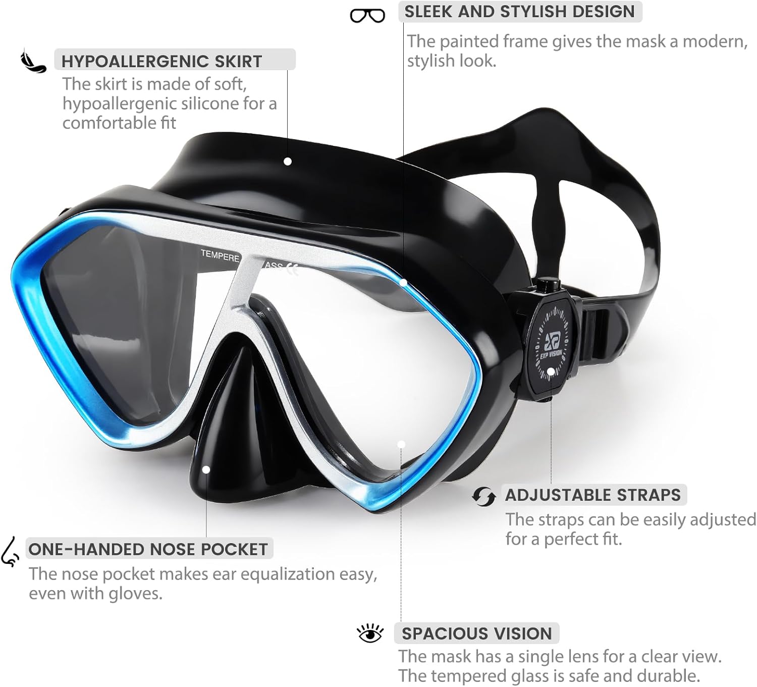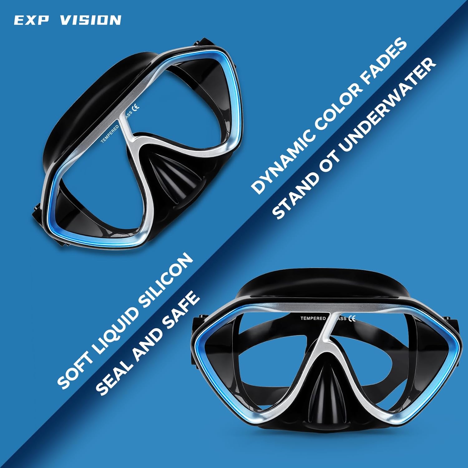 - 【❤️Warm Tips❤️】Please be EXP VISION that this DIVING MASK IS NOT ACCEPTABLE TO DIVE OR JUMP INTO WATER when put it on face. Otherwise it may shatter into pieces. For your safety, please don't do that.
