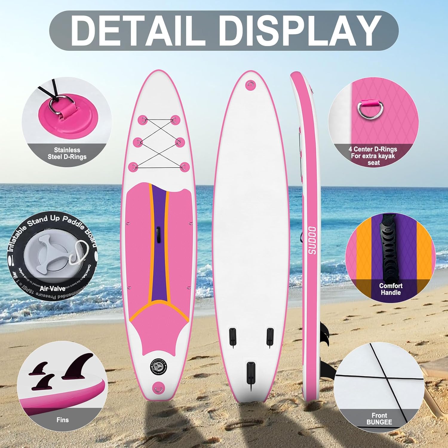 - ๐ก๏ธ Military-Grade Durability & Safety: Featuring a 4mm EVA anti-skid pad with cross-vertical traction design, this SUP board ensures slip-resistant performance even in wet conditions. The 2-layer PVC construction (0.7mm waterproof fabric + reinforced outer layer) and V-drop stitch core withstand 15 PSI pressure, backed by a 120N tensile force for puncture resistance.