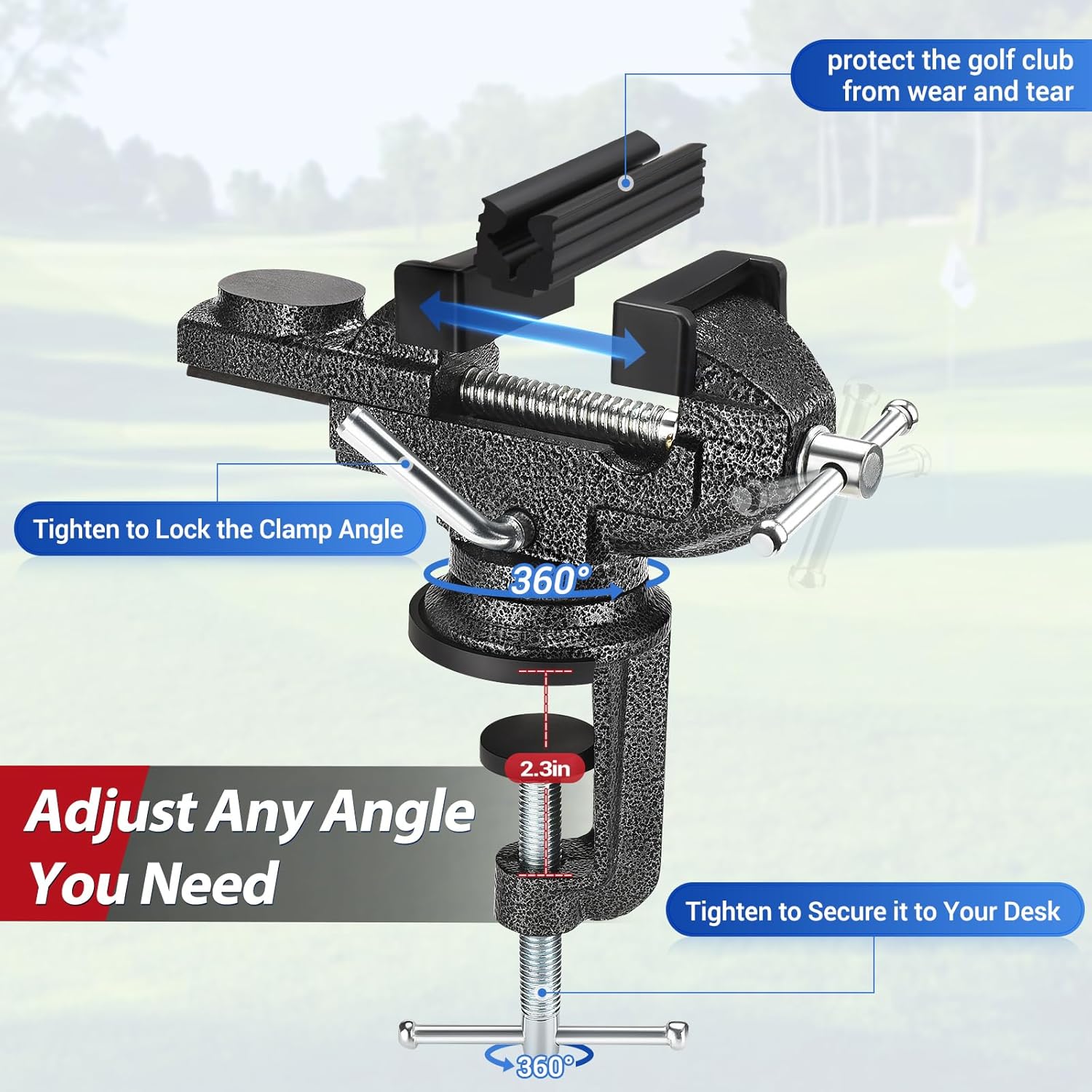 - [Rubber Vise Clamp]This table vise, with rubber sleeves and pads, boosts clamping force and easily attaches to your tabletop. It securely grips the golf clubs, allowing for easy angle adjustments while remaining stable for regripping or repairs. The golf grip changing kit also protects the club from damage and can holds item up to 2.3 inches thick.