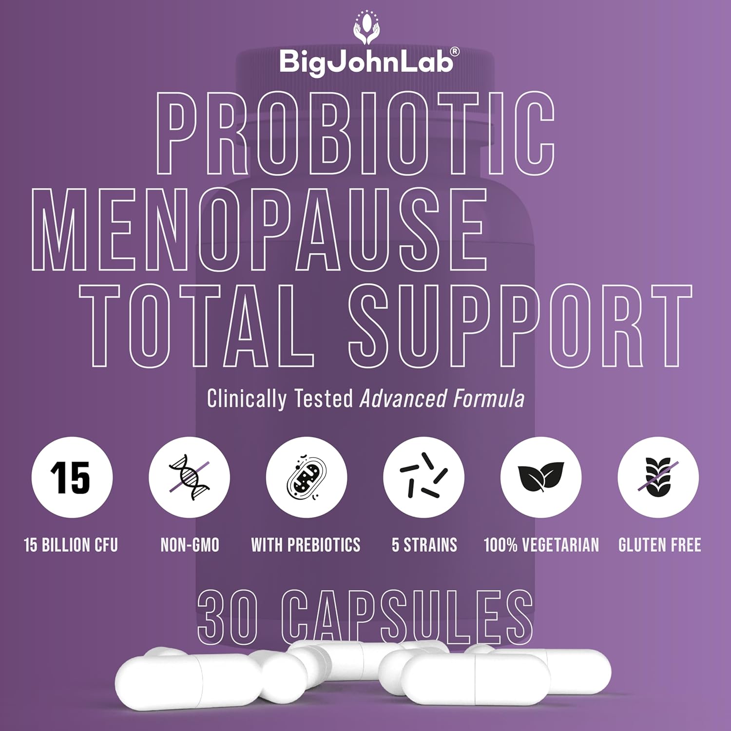 BIGJOHNLAB® - Menopause Total Support – Advanced Probiotic Formula with 5 Strains & 15 Billion CFU, Resveratrol, Black Cohosh, Acacia Fiber, Non-GMO & 100% Vegetarian
