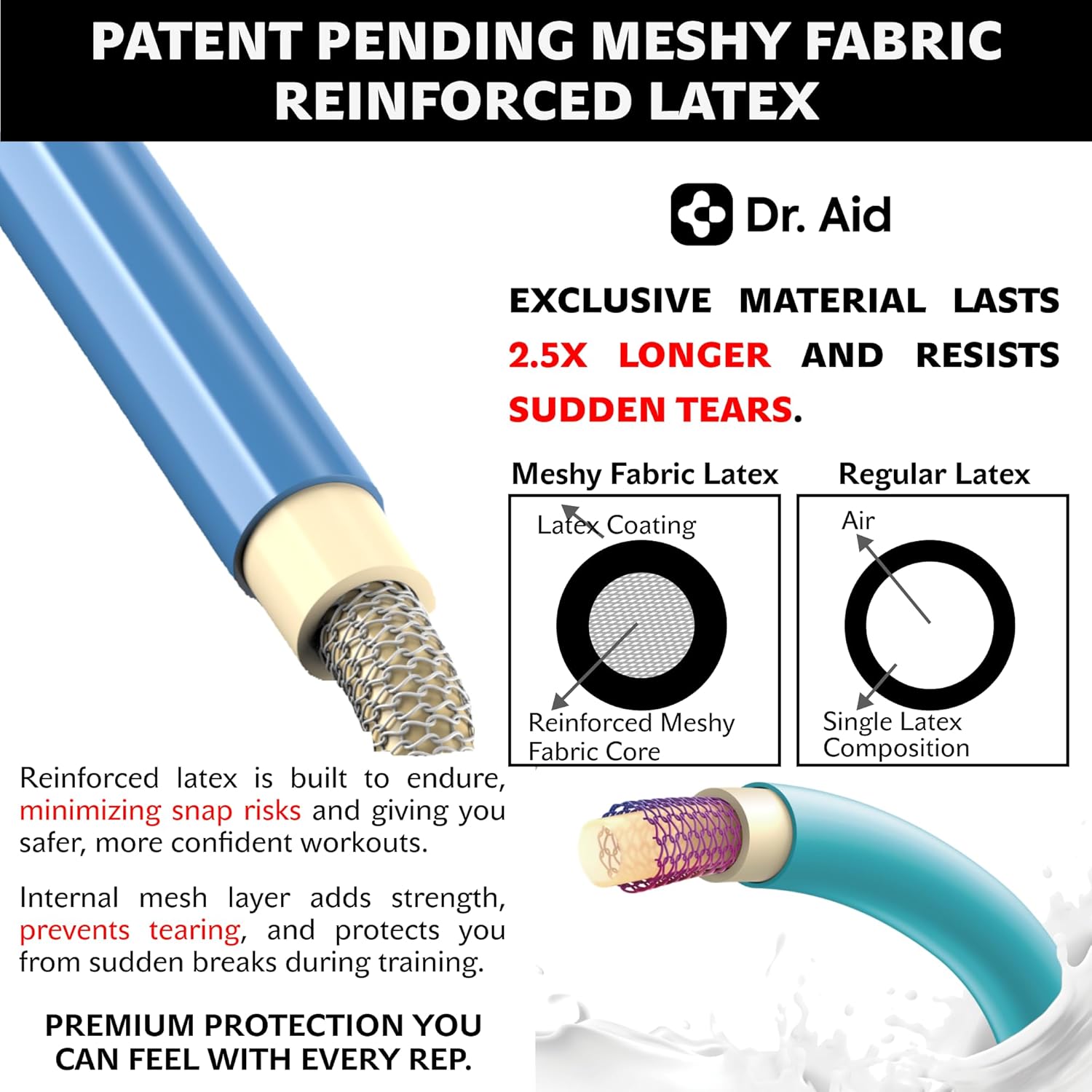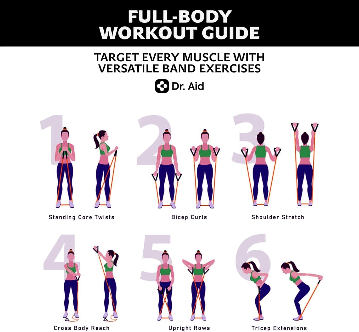 - Train every muscle, anywhere: Transform any space into your personal gym with Dr. Aid bands for working out. Designed for full-body training, these workout bands resistance sets help strengthen arms, shoulders, chest, core, glutes, and legs—anytime, anywhere. Whether you’re doing upper-body sessions at home, lower-body stretches on the go, or full routines at the gym, these stretch bands for exercise provide portable power and targeted muscle activation.