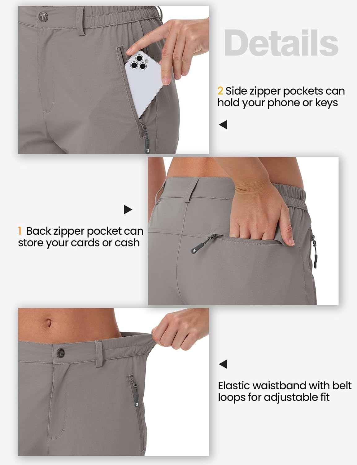 - 3 Zipper Pockets: 2 side zippered pockets and 1 back zippered pocket provide secure storage for essentials like phones and keys