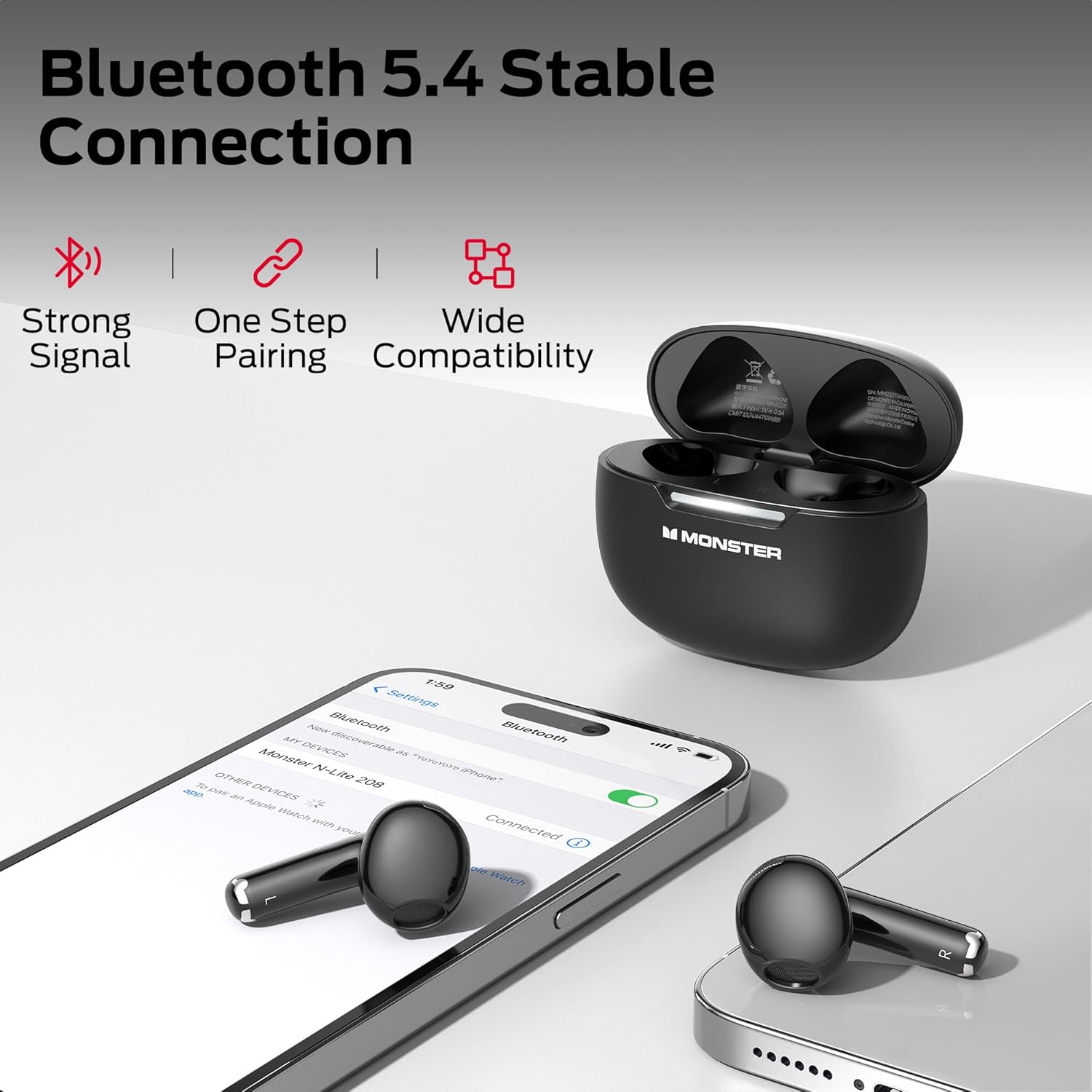 Monster N-Lite 208 Wireless Earbuds, Bluetooth Earbuds Touch Control, Bluetooth Headphones with 30H Playtime, Wireless Headphones Type-C Fast Charging, Clear Call, Comfortable Fit for Running