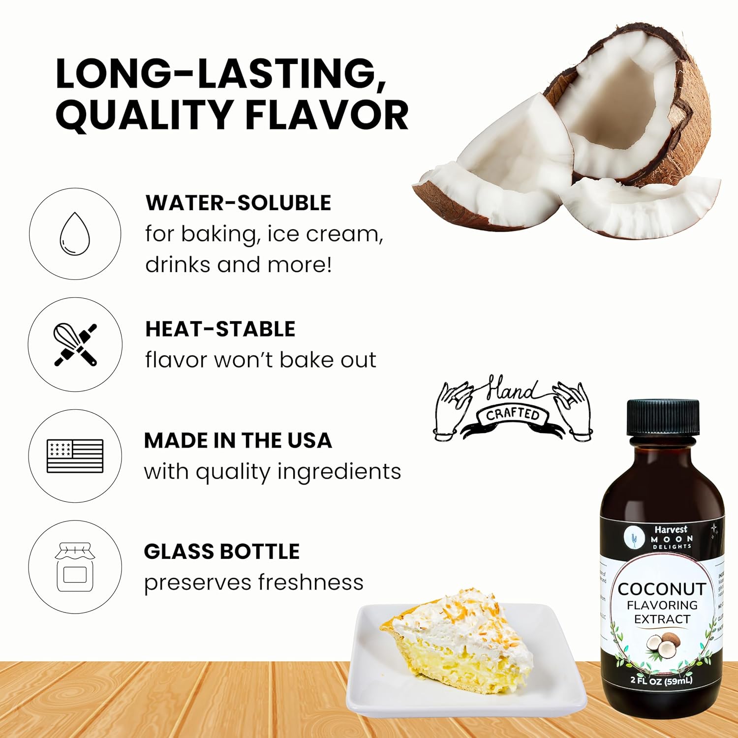 Natural Coconut Extract - 2 oz - Water-Soluble - By Harvest Moon Delights - Coconut Extract for Baking, Ice Cream, Drinks, and Candy - Flavoring - Sugar Free