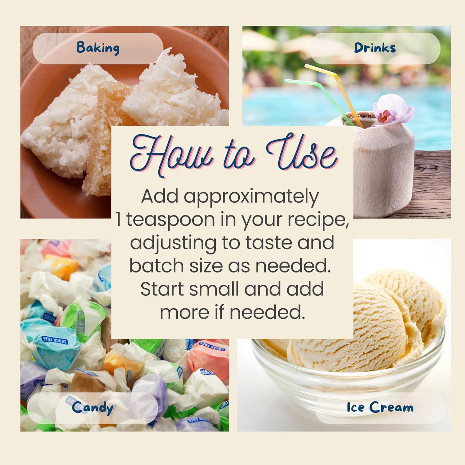 - YOUR PACKAGE INCLUDES: A 2 oz glass bottle of premium, water-soluble natural coconut flavor, crafted with quality ingredients right here in the USA.