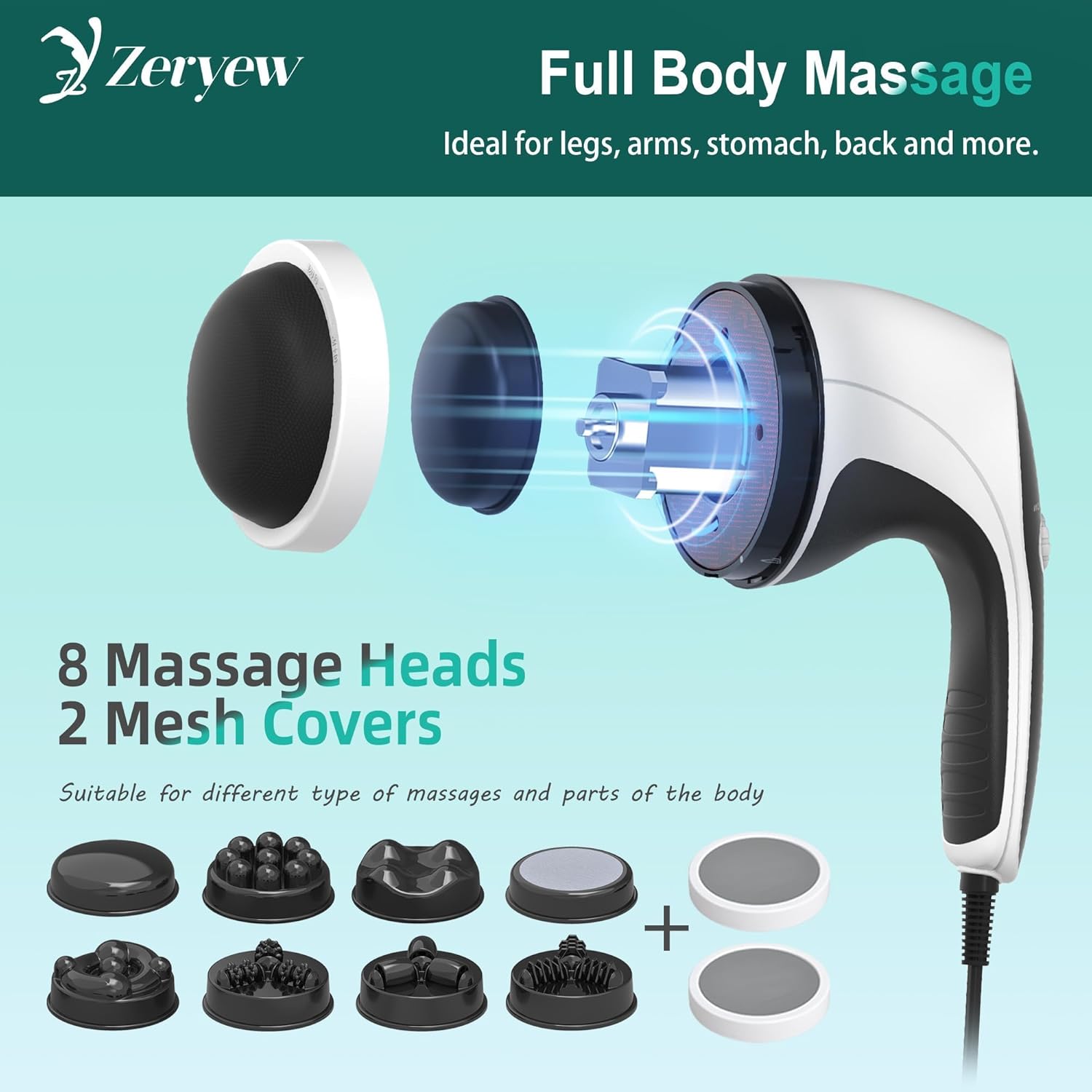 - Customizable Massage Settings: The handheld cellulite massager has only one rotary switch, you can easily adjust the level of intensity to fit what feels good to you. Equipped with 8 interchangeable heads and 2 mesh covers, provides more massage experience, replace massage heads can be used for different purposes and on various areas of the body.