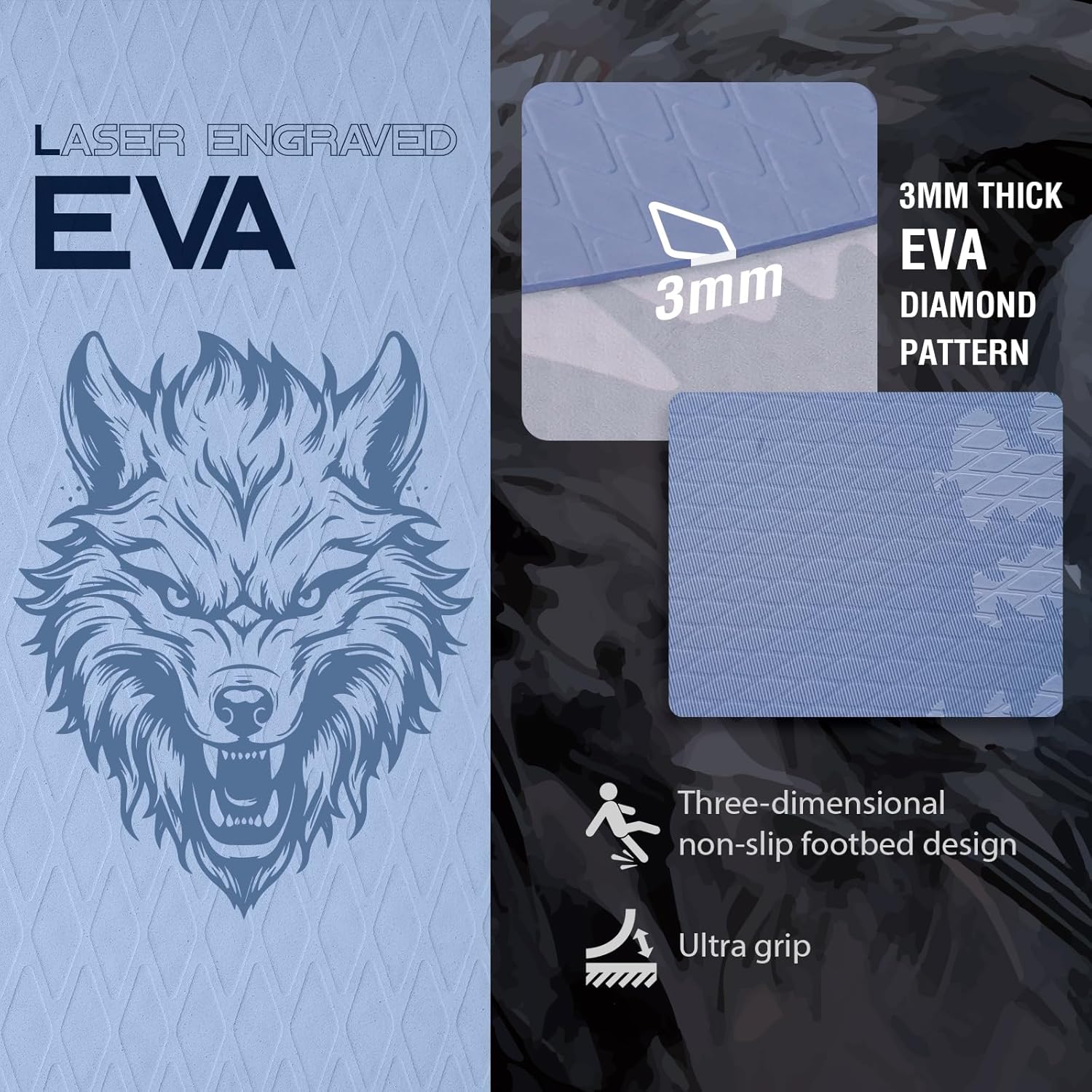 - 【Laser engraved EVA】 Surface laser engraved 3mm thick EVA diamond pattern, high coefficient of friction (≥0.6), wet still maintain a strong grip, with three-dimensional non-slip foot pad design, to avoid slipping and falling, the safety coefficient of pull full.