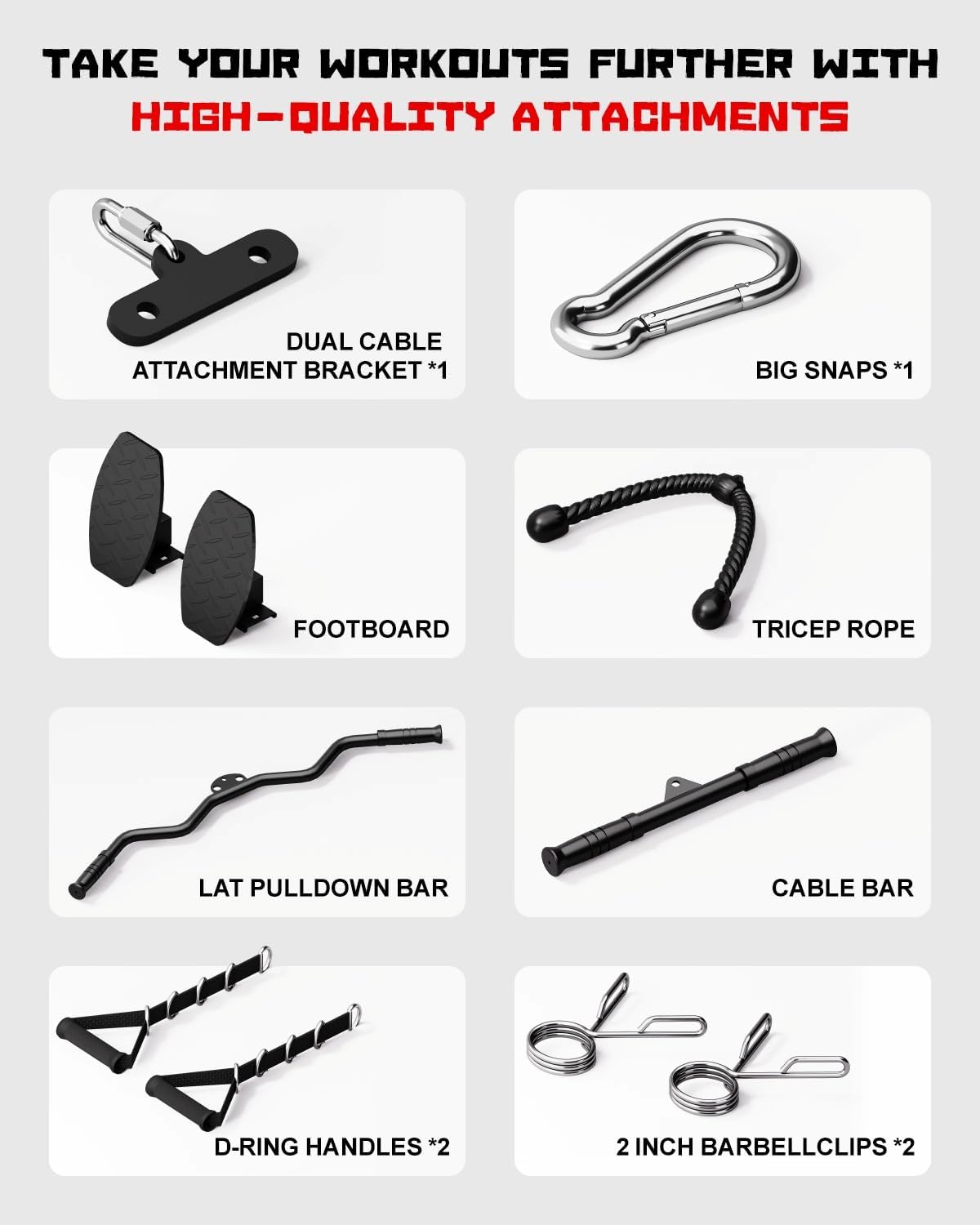 - 【All-in-One Gym Solution at 50% Less Cost】 Transform your garage/home gym into a professional fitness hub without breaking the bank! This 3.12-sq.ft wonder combines lat pulldown machine, seated rowing machine, cable crossover machine, bicep curl machine, single arm cable rowing machine and so on in one. All included attachments let you perform 99% of cable exercises (No extra purchases needed).
