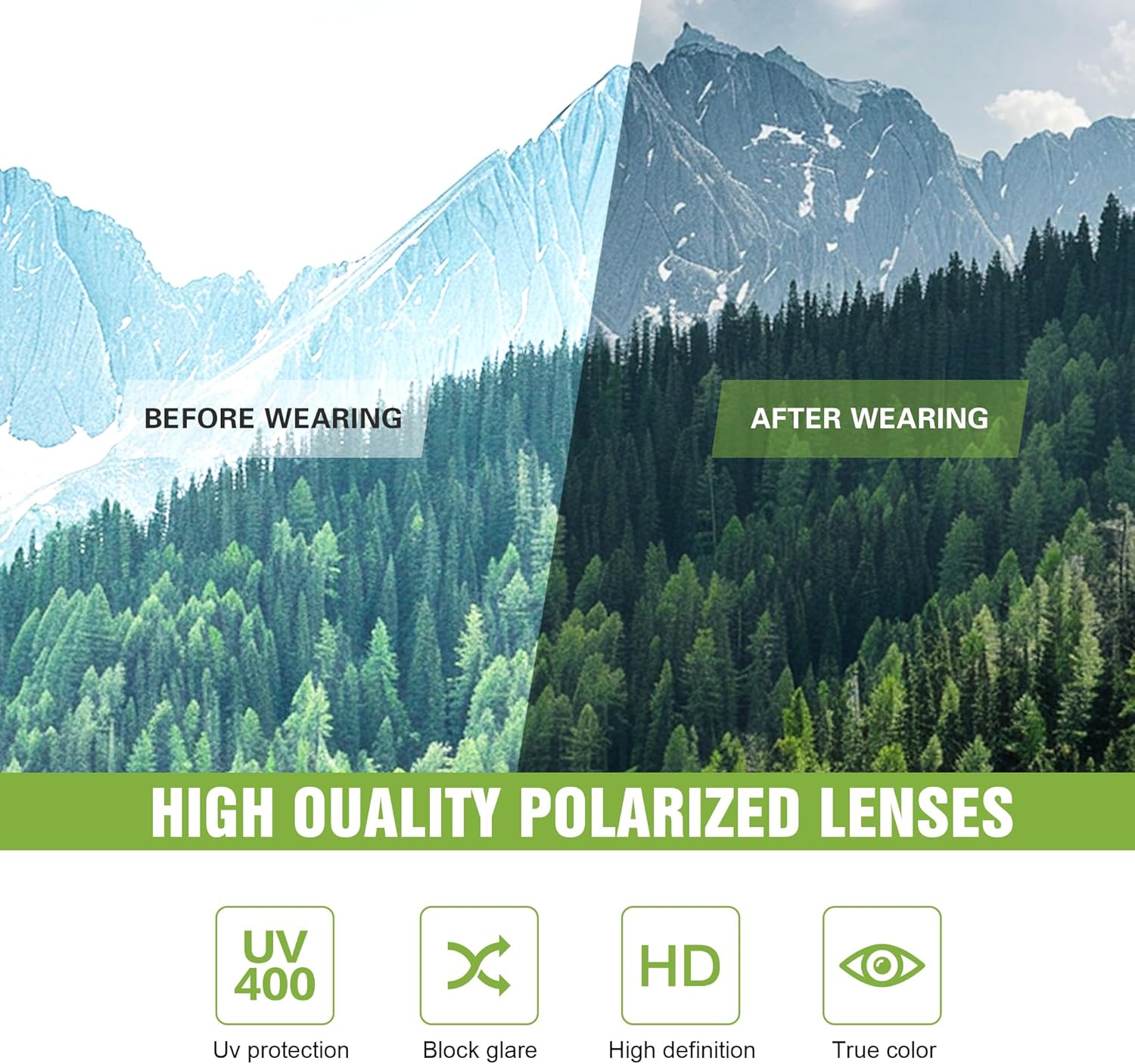 - UV Protection & Clear Vision: Utilizing advanced UV400 lens technology, these mens polarized sunglasses effectively block over 99.9% of harmful UV rays, providing comprehensive protection for your eyes. The HD polarized mens fishing running sunglasses lenses reduce glare and reflections, delivering a clear visual experience for any outdoor activity, whether it's fishing or running