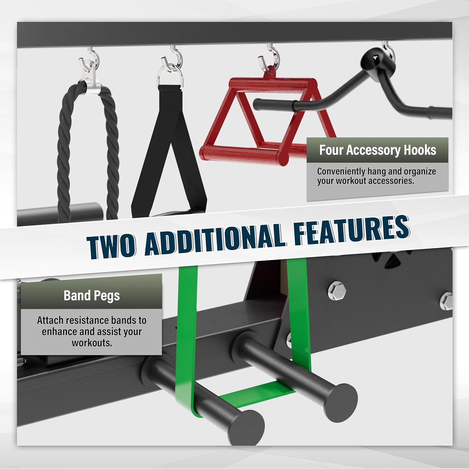- Comprehensive Set of Exercise Accessories: Equipped with safety arms, foot pedals, J-hooks, landmine attachment, dip bars, T-bars, LAT pulldown bar, cable bars, and resistance band pegs. These accessories enable a wide range of exercises targeting various muscle groups, maximizing your workout potential