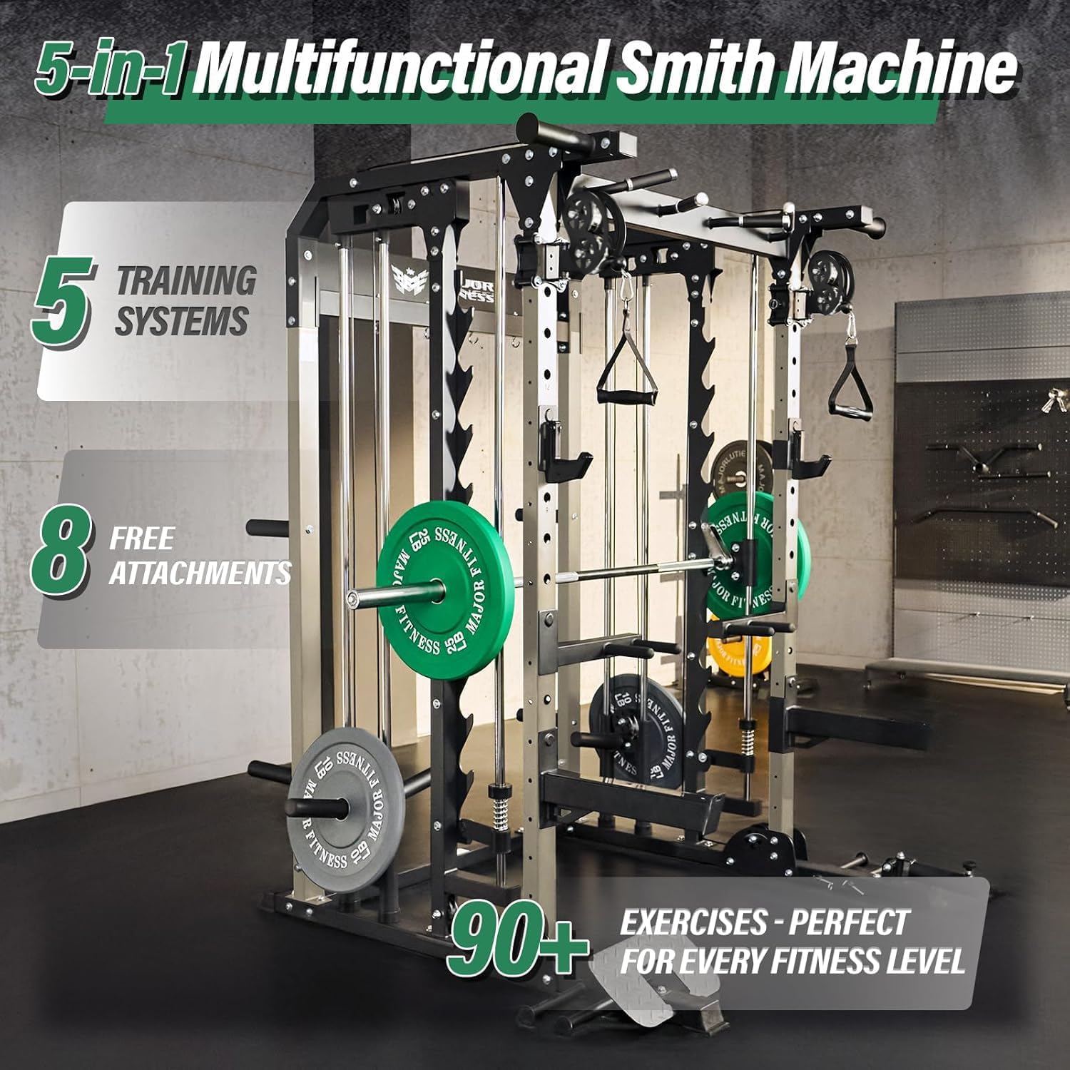 - All-in-One Smith Machine Home Gym for Full-Body Workouts, the B52 squat rack combines multiple systems: a machine with power rack, cable crossover machine, landmine attachment, and multi-grip pull-up bar. With 90+ exercise options, it offers a complete solution for strength training within a compact footprint.