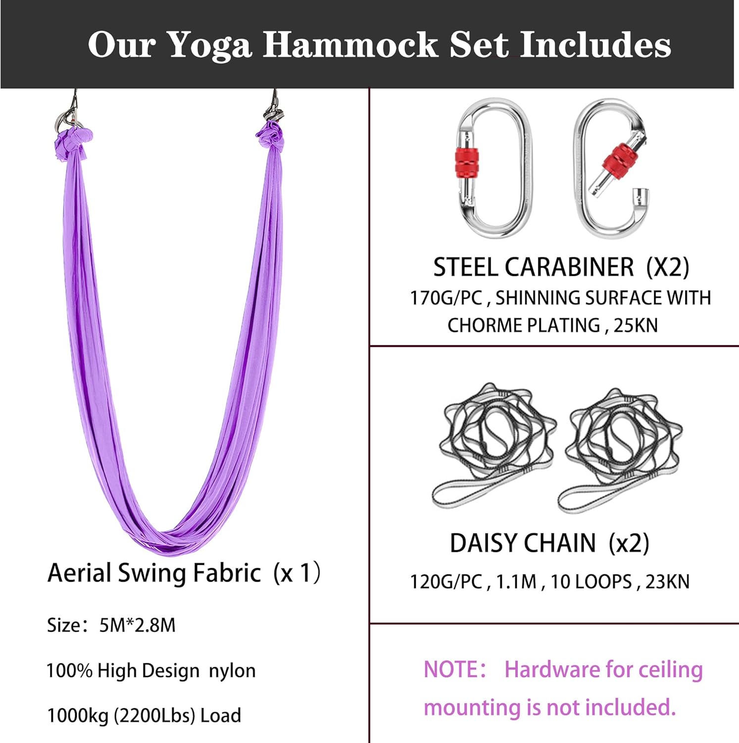 - 【HEAVY-DUTY HARDWARE】The flying aerial yoga swing includes all the heavy duty hardware required to safely install it yourself. You will get 5.5 yards aerial silk, 2 x daisy chains,2 x Steel Carabiners, 1 x Installation instructions. They are strength and safety certified with,The fabric is rated for 2,000 pound dynamic load. NOTE: Hardware for ceiling mounting is not included.