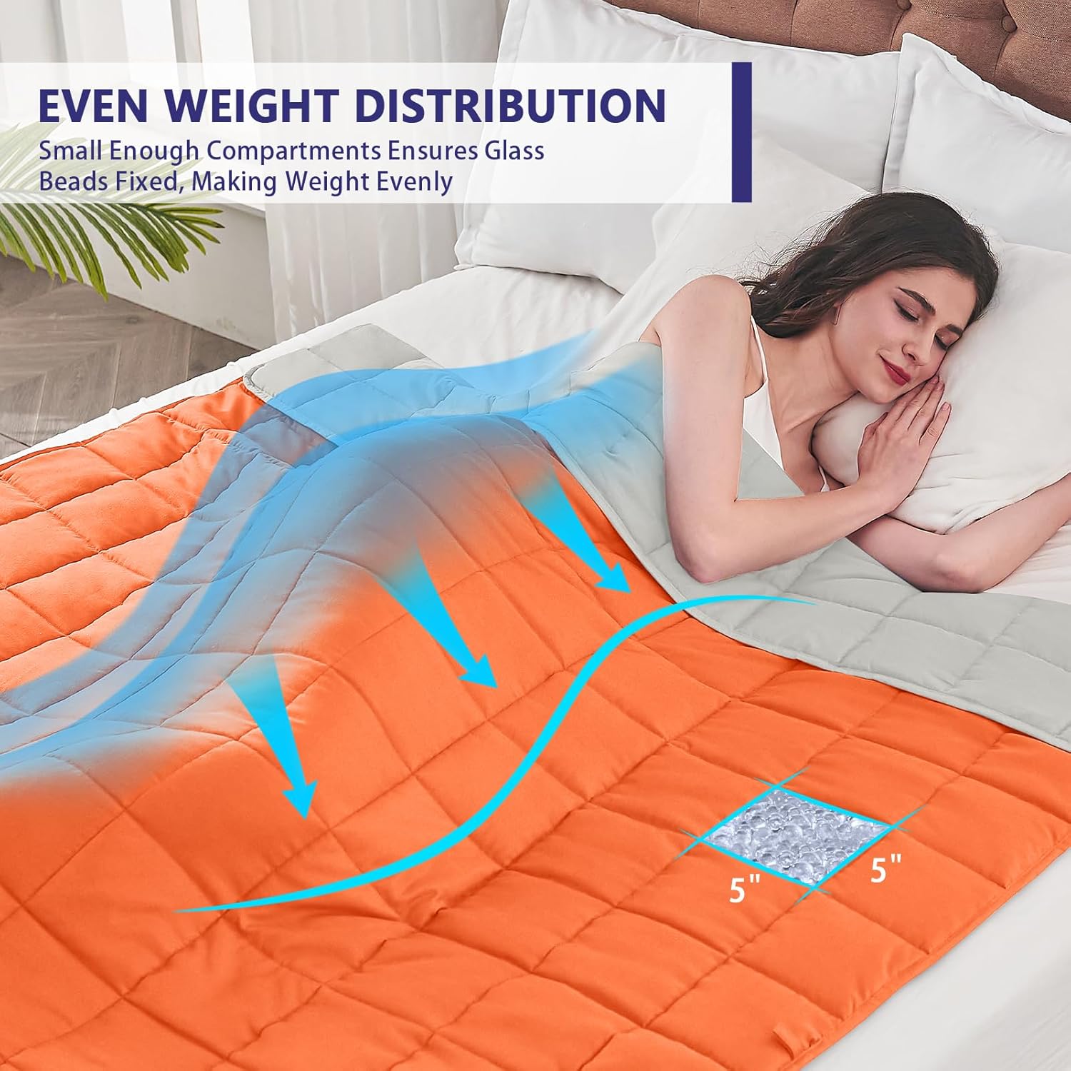- 🌙【TIGHTLY STITCHING&DURABILE】: Our weighted blanket for women&man composed of 5"x5" small enough compartments stitched by high-density 15000 stitches to tightly make glass beads stay put in the square all the time to bring you a more durable weighted blanket with no glass beads leakage.