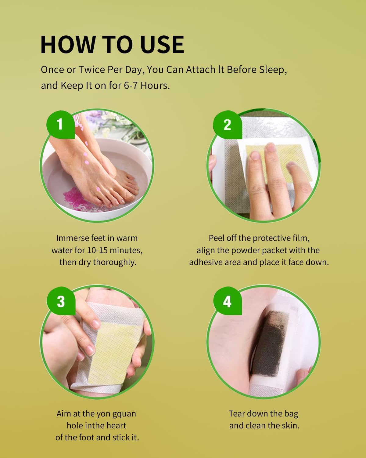 - Simple Application: Fix the foot pads in the middle of your feet before going to bed. Wait for 6-8 hours to be fully absorbed before gently removing the foot pads. Clean your feet afterwards and enjoy better comfort!