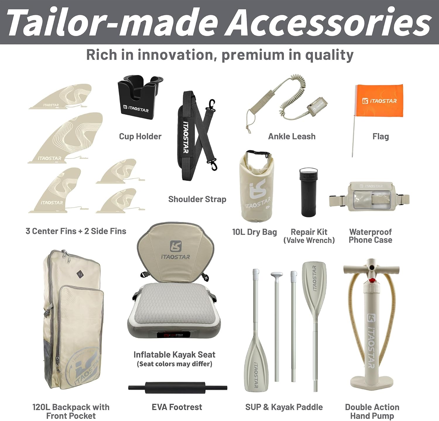 - Tailored One-Stop Accessories - Our iSUP set features more stuff than others, which include an adjustable paddle with kayak kit, 5 fins, seat, footrest, double-action pump, shoulder strap, ankle leash, waterproof pouch, 120L backpack, 10L dry bag, cup holder, flag, valve wrench, and manual
