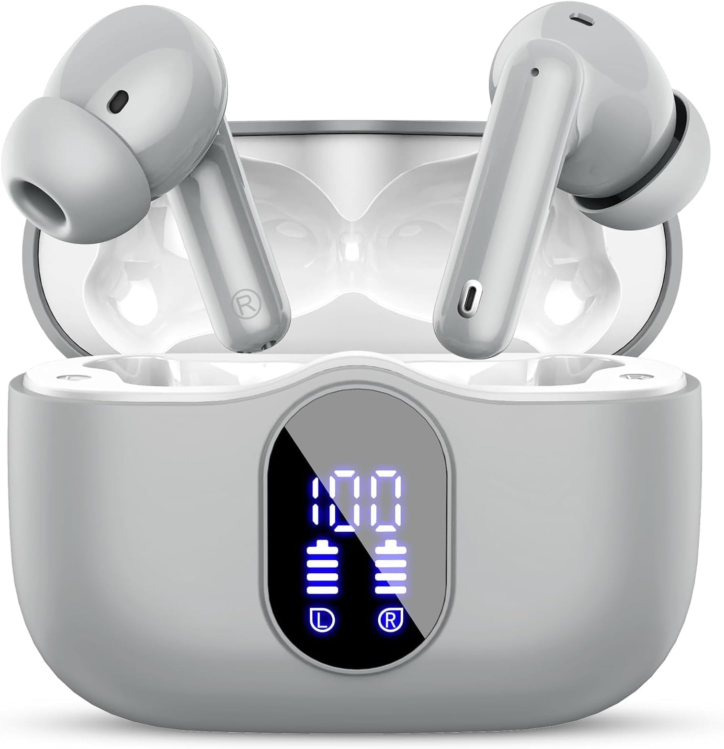 Wireless Earbuds, Bluetooth 5.4 Headphones Bass Stereo, Ear Buds with Noise Cancelling Mic, IP7 Waterproof in Ear Earphones, 36H LED Display Bluetooth Earbuds for Laptop Pad Phones Sports, Grey