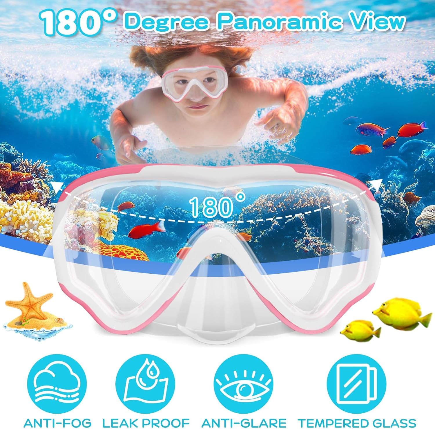 - [Professional children's swim goggles] Children's swim mask is a snorkeling equipment designed for children. Tempered glass diving goggles are made of high-quality glass materials with high hardness and wear resistance, which can effectively resist friction and collision during diving and is not easy to break. Don't worry about hurting the baby's eyes anymore.