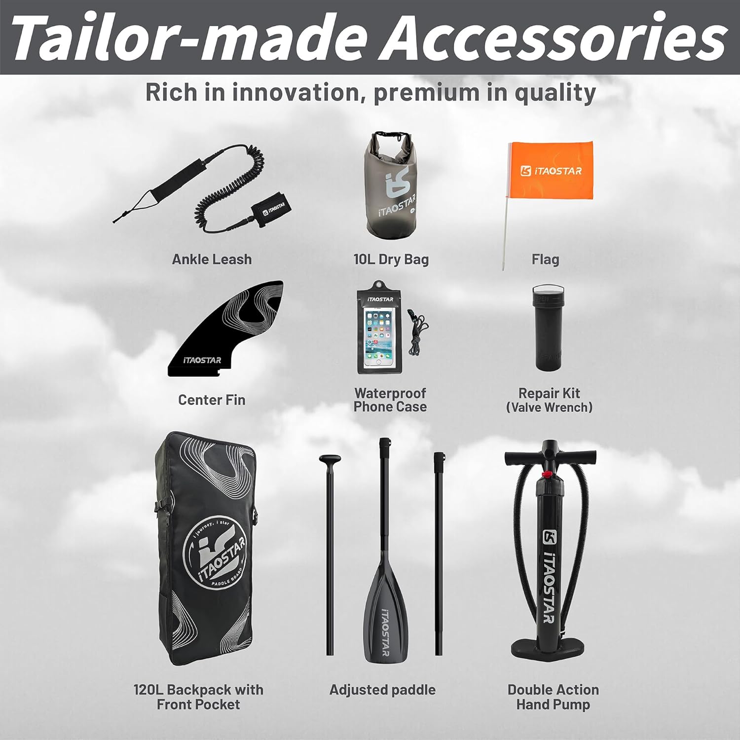 - Tailored One-Stop Accessories - Our iSUP set features more stuff than others, which include an adjustable sup paddle, 1 fin, double-action pump, ankle leash, waterproof cell bag, 120L backpack, 10L dry bag, flag, valve wrench, and manual
