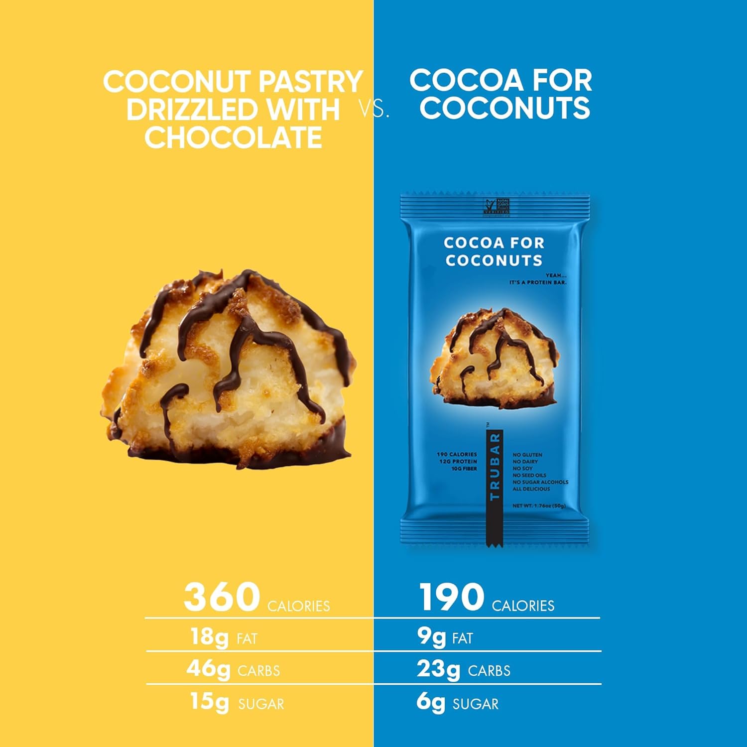 TRUBAR Vegan Protein Bar, Cocoa For Coconuts, Gluten Free, Plant Based Protein, Dairy Free, Non GMO, Soy Free, No Sugar Alcohols, 12G Protein, 12G Fiber, 23G Carb, On the Go Snack Bars, 12ct