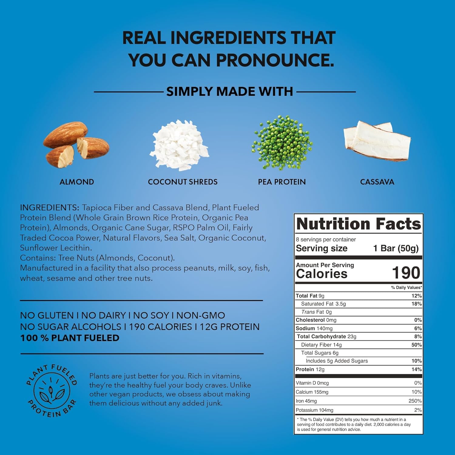 - ENJOY GUILT-FREE INDULGENCE: Dive into the deliciousness of our Cocoa For Coconuts Protein Bars that blend real ingredients you know, like Almonds, Cassava, and Pea Protein. Completely free of gluten, dairy, and soy, without GMOs or sugar alcohols, and just 190 calories per serving. Each bar delivers 12g of lean, plant protein and 12g of fiber, plus essential minerals, for a tasty snack that’s as nourishing as it is satisfying. Indulge smartly with plant-fueled enjoyment!